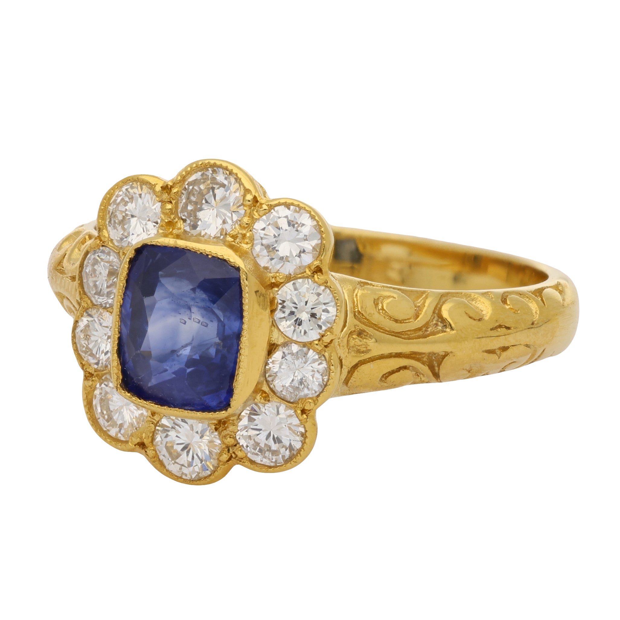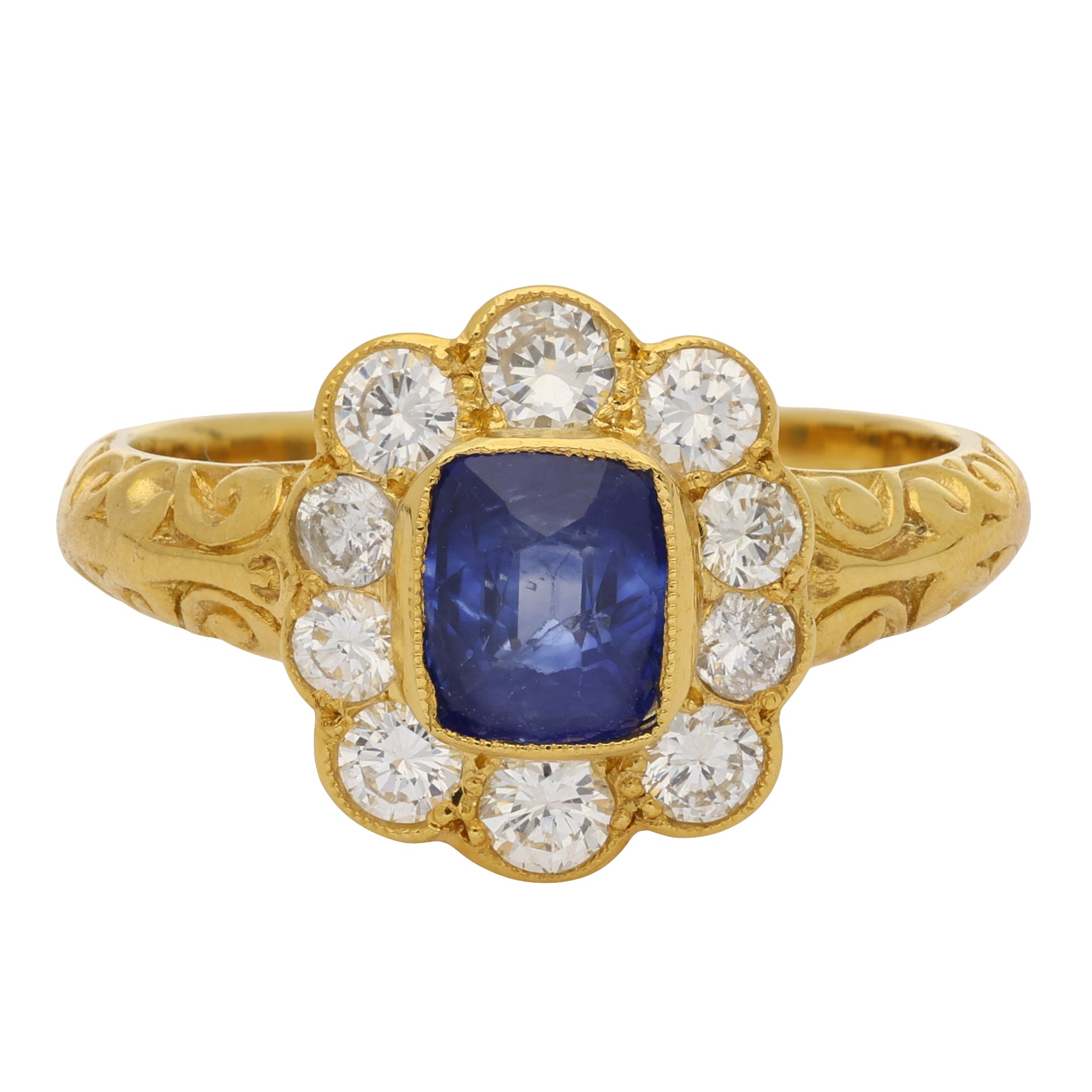 Vintage Cushion Cut Blue Sapphire and Diamond Cluster Ring