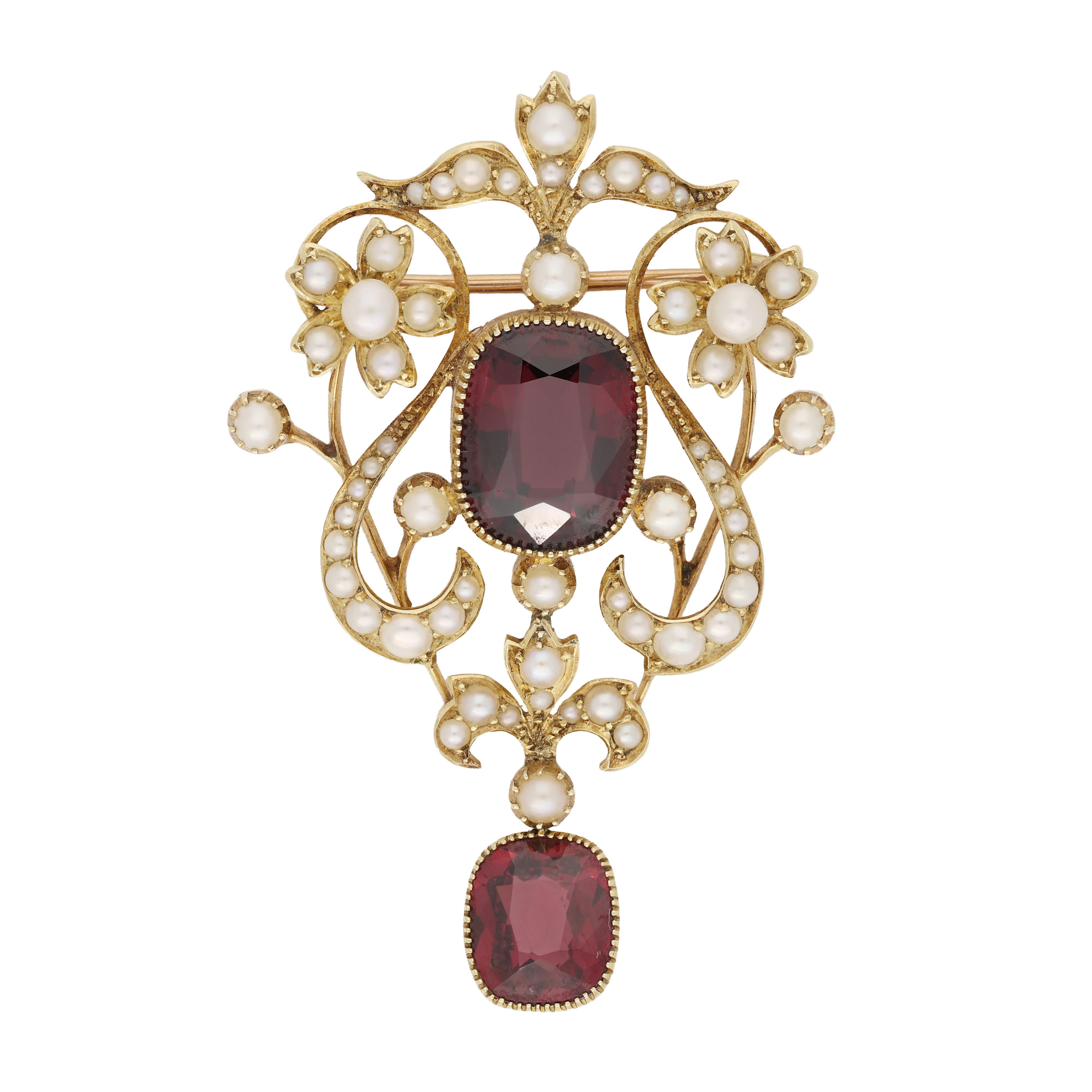 Antique 15ct Gold Seed Pearl and Garnet Pendant Brooch
