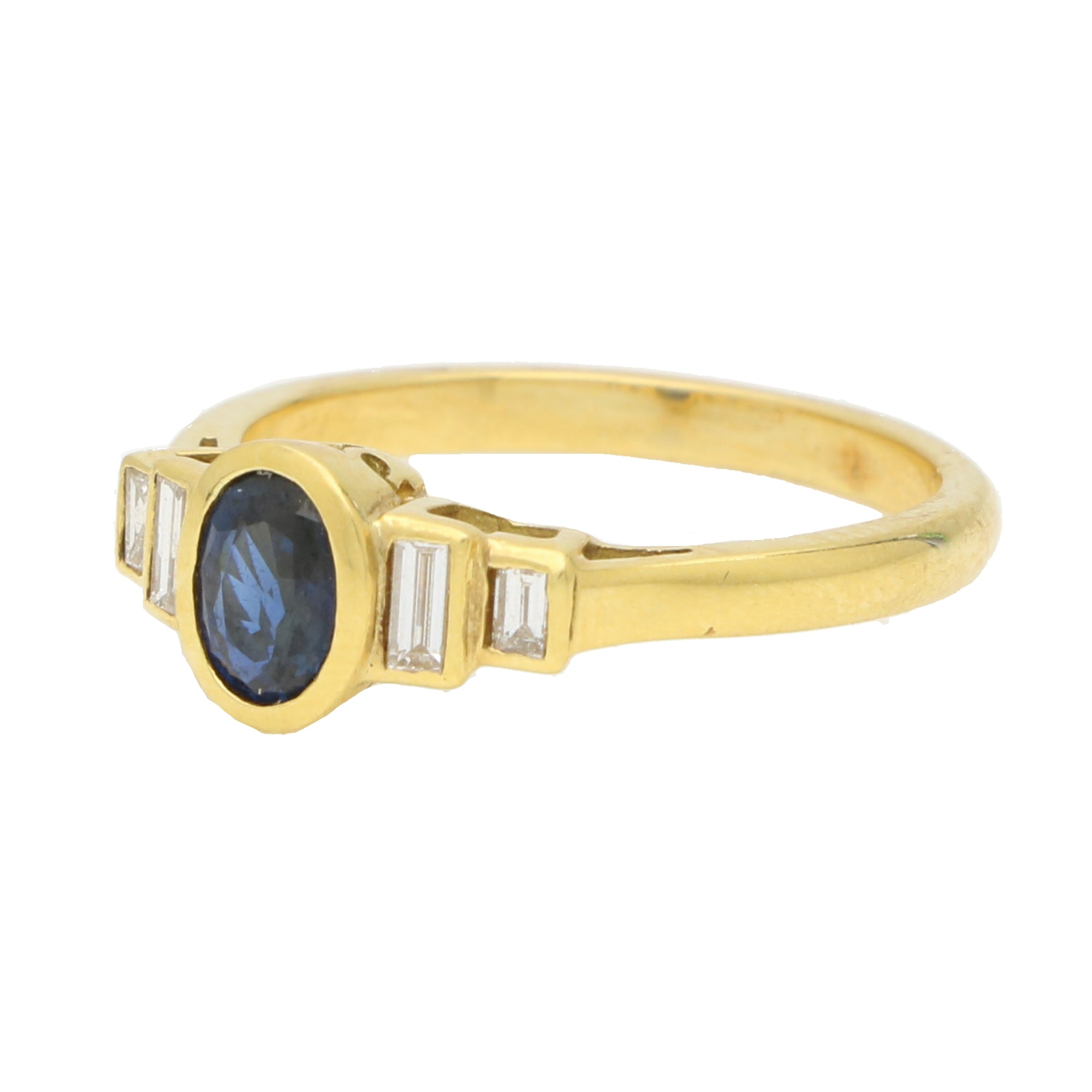 Art Deco Style Blue Sapphire and Baguette Cut Diamond Ring