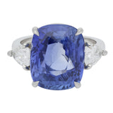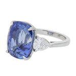 A beautiful cushion cut blue sapphire and diamond three stone ring set in platinum.