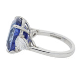 The ring is centrally set with a vibrant blue cushion cut sapphire, which is securely four claw set. The sapphire is sided by two pear cut diamonds which beautifully highlight the vibrancy of the sapphire. The head of the ring leads to a solid platinum band.