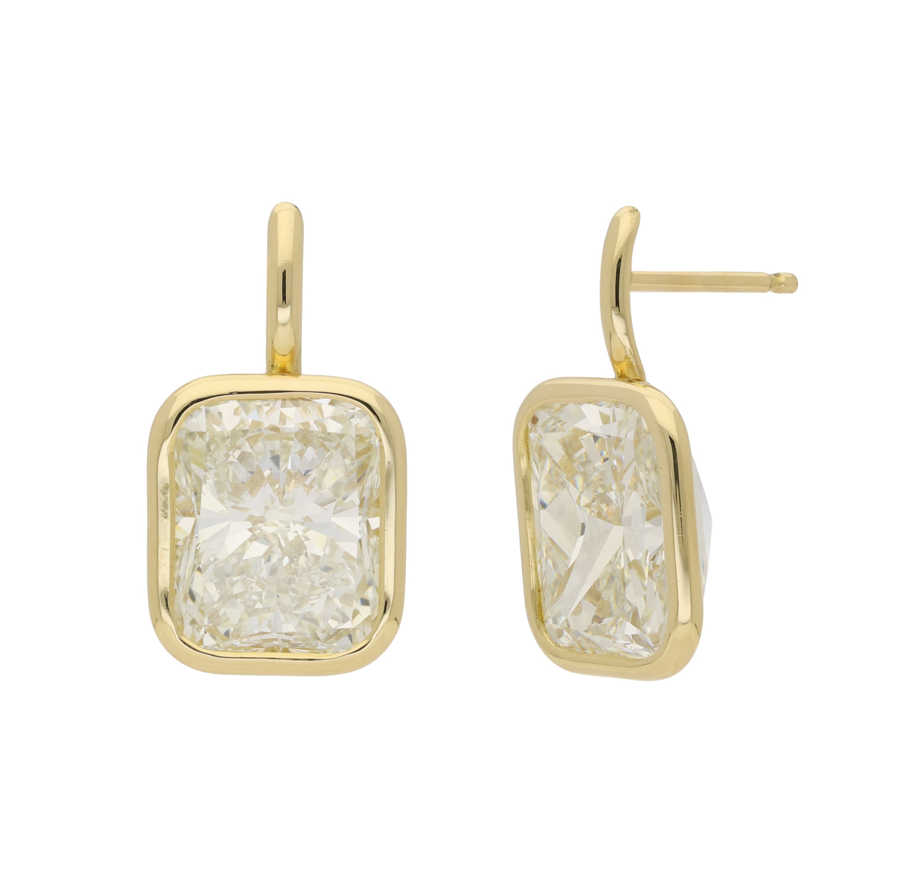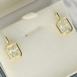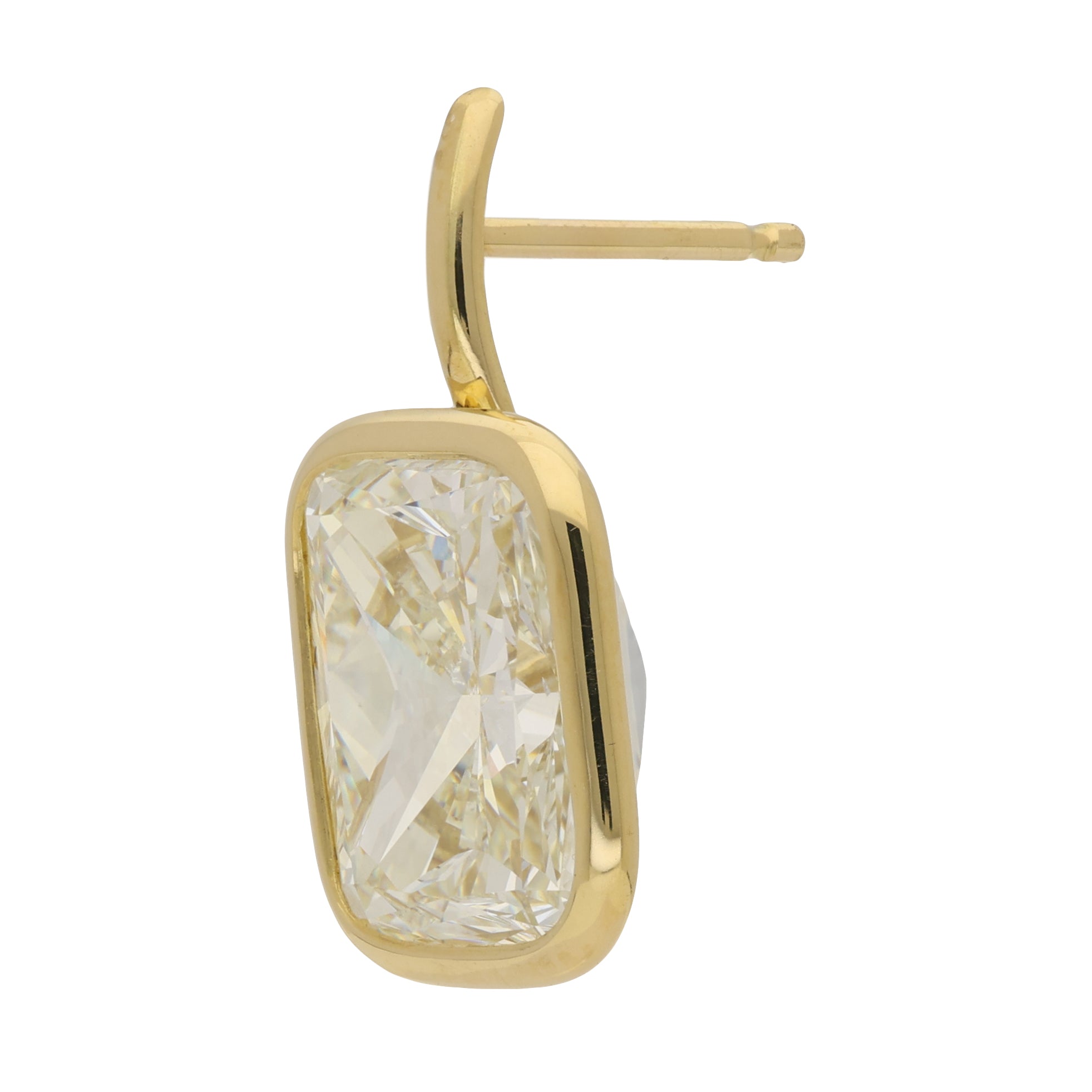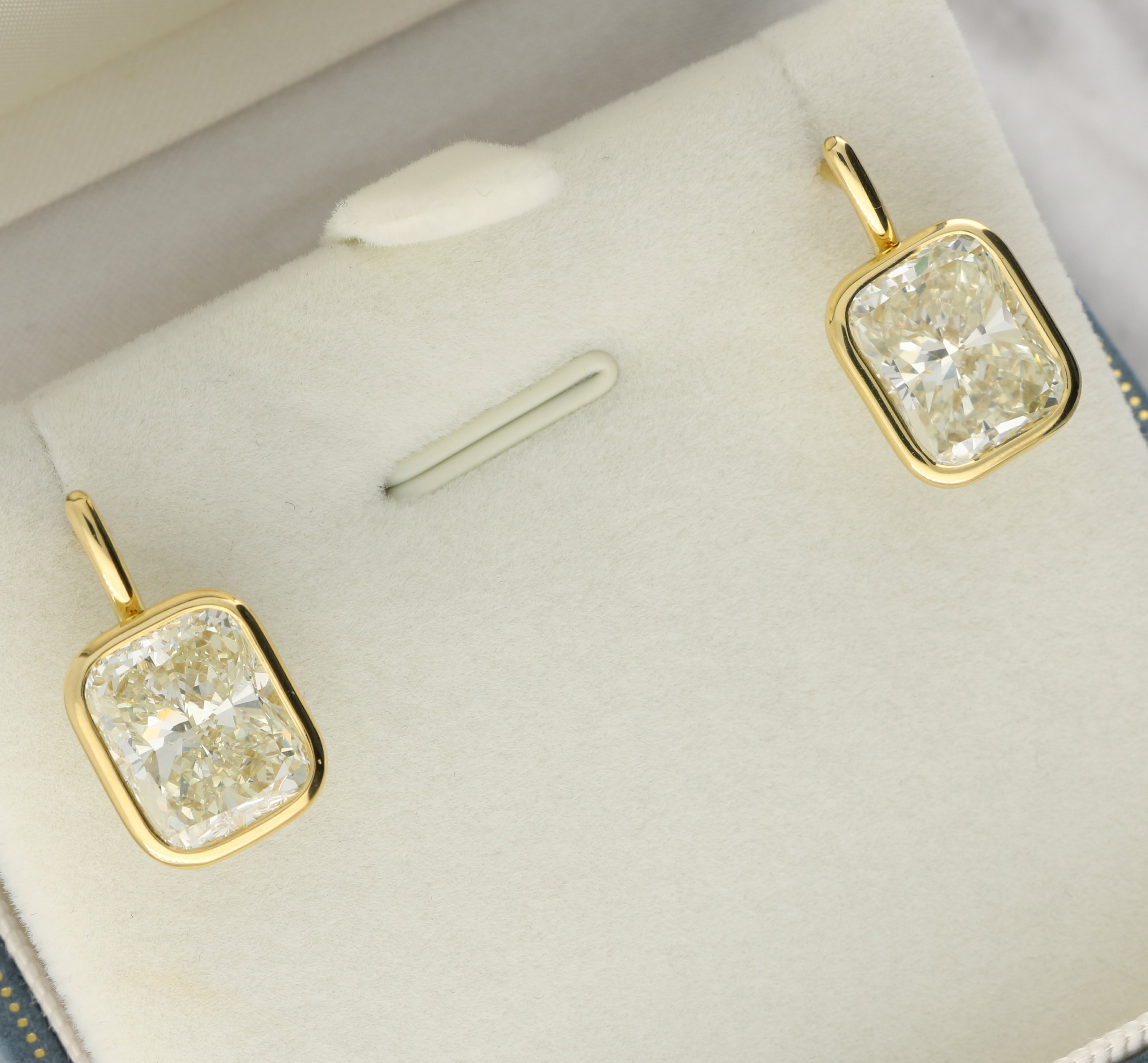 These drop earrings feature cushion-cut diamonds in smooth bezel settings. The rounded square shape softens the outline of each stone, while the bezel frame gives a clean and modern finish.