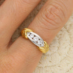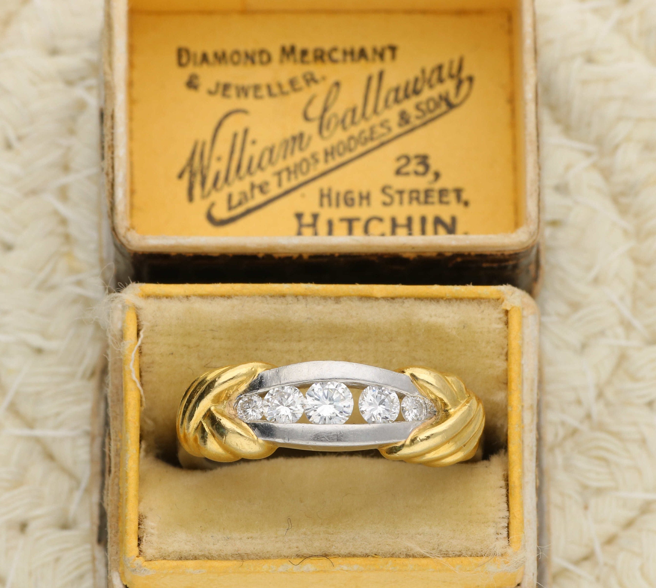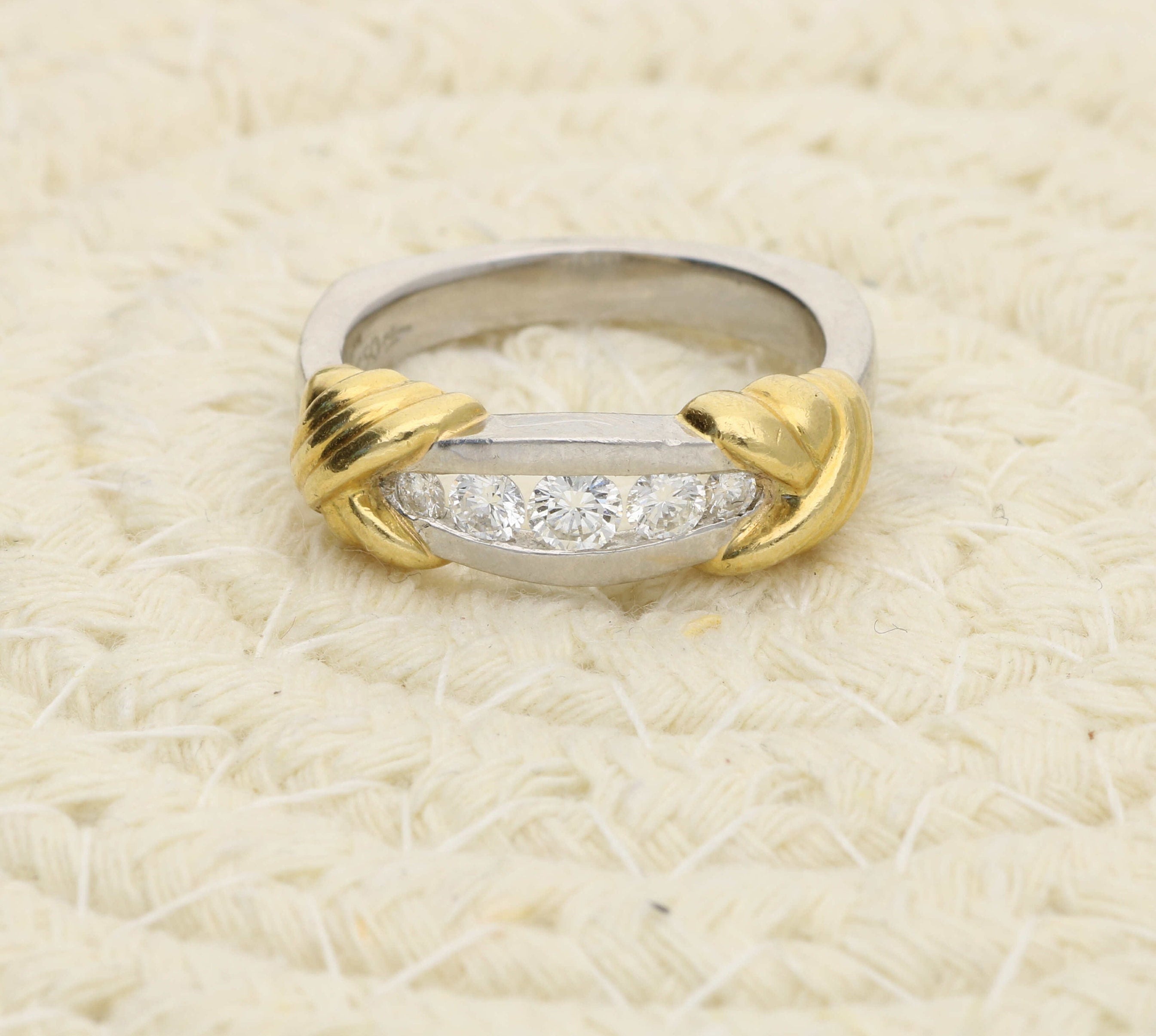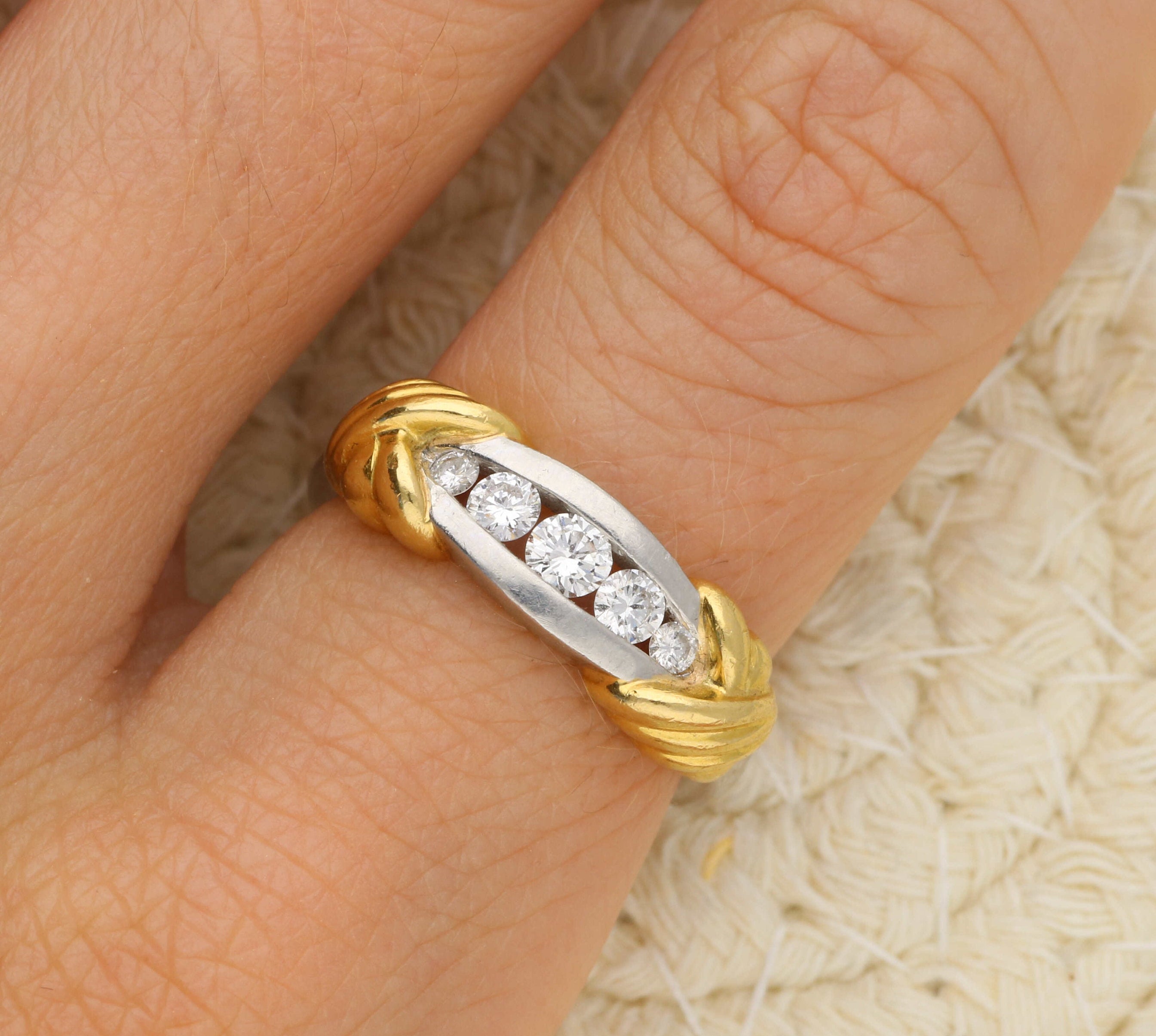 A unique yellow gold 5-stone diamond ring. This ring would make a perfect statement piece or a great addition to an everyday ring stack.
