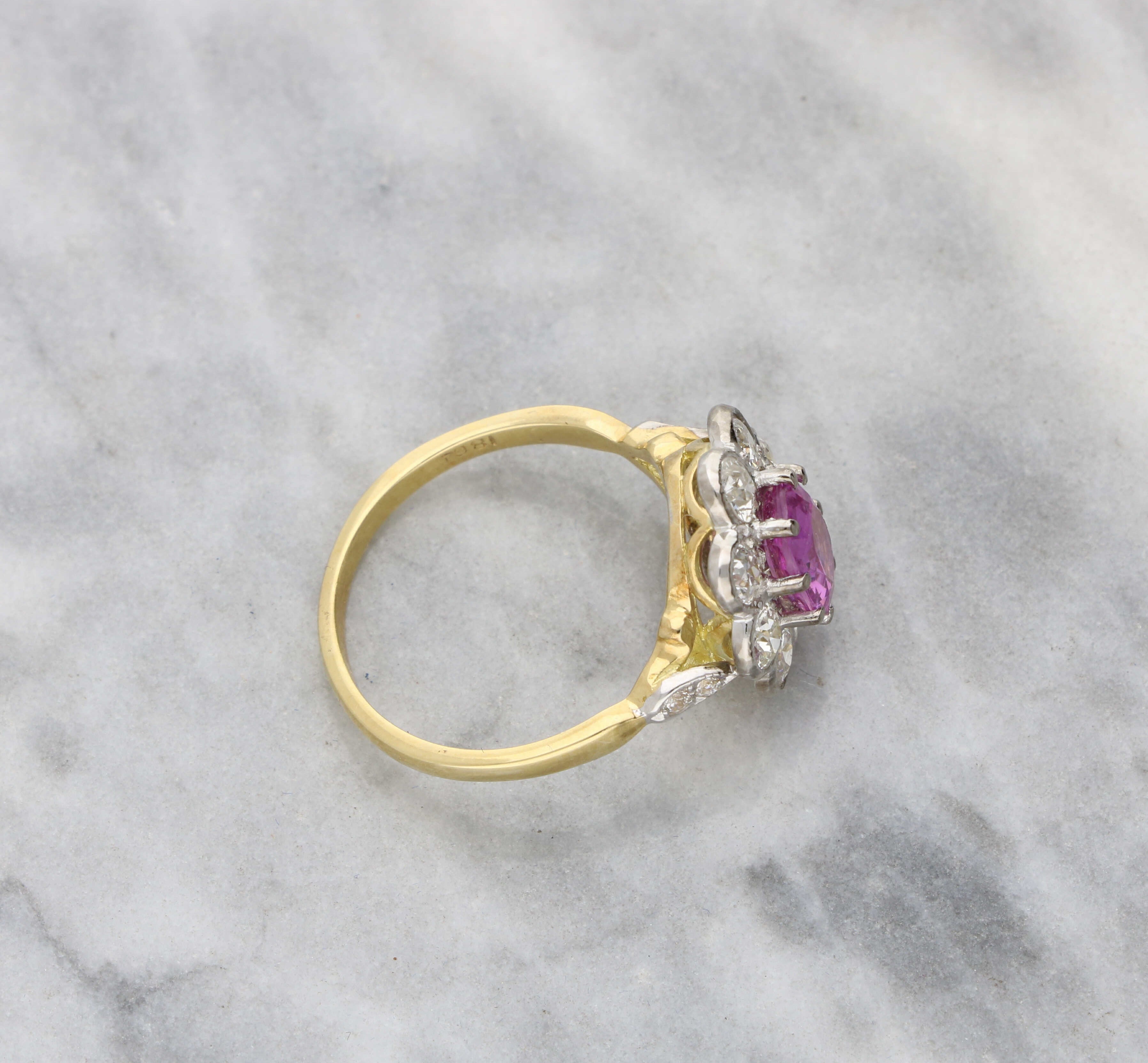 A stunning 18ct yellow gold pink sapphire and diamond cluster ring. The pink sapphire weighs 1.81ct and is surrounded by 0.75ct of round brilliant diamonds. The head of the ring measures 15x14mm. This ring is a UK size O / US size 7.