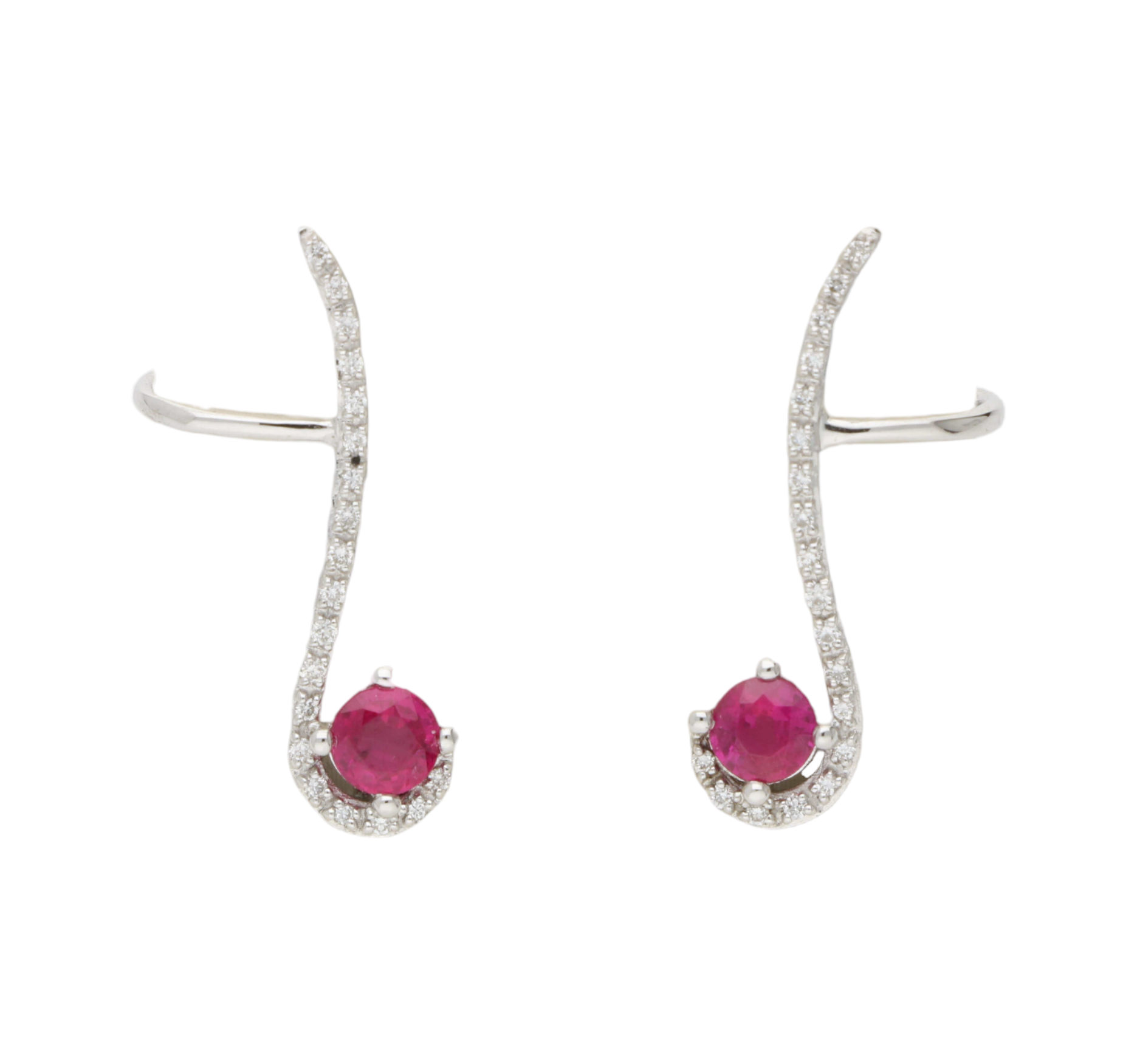 A pair of white gold pink sapphire and diamond cuff earrings.