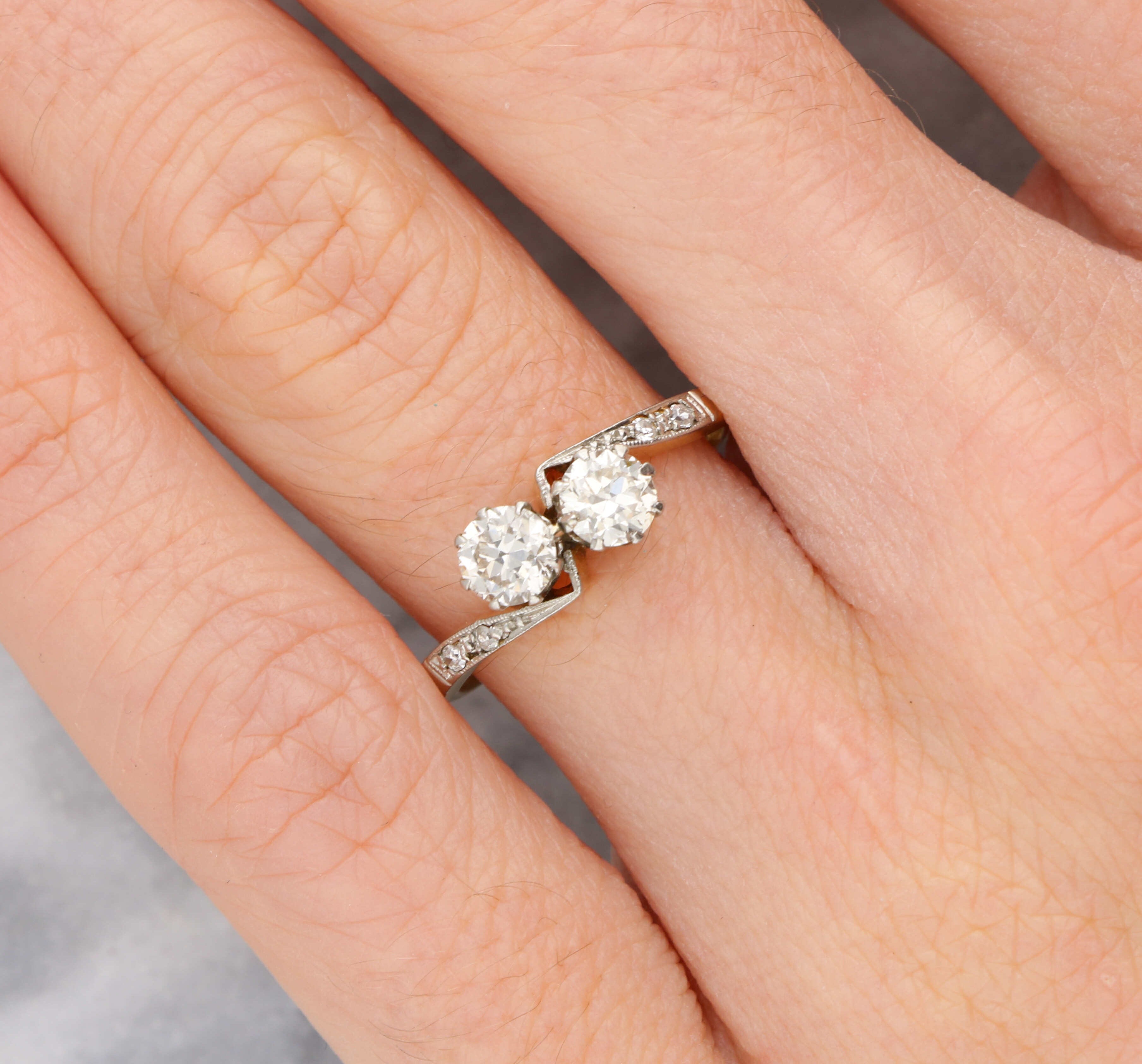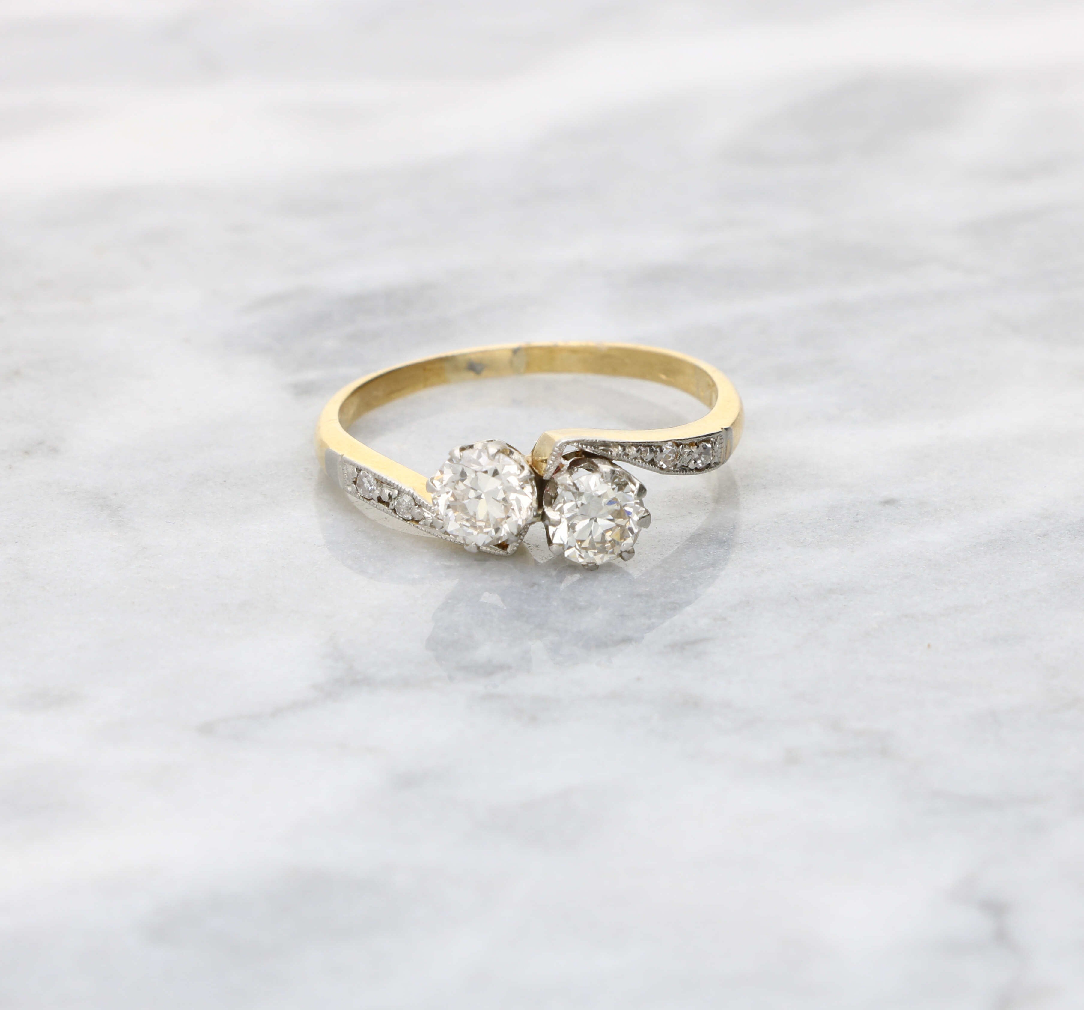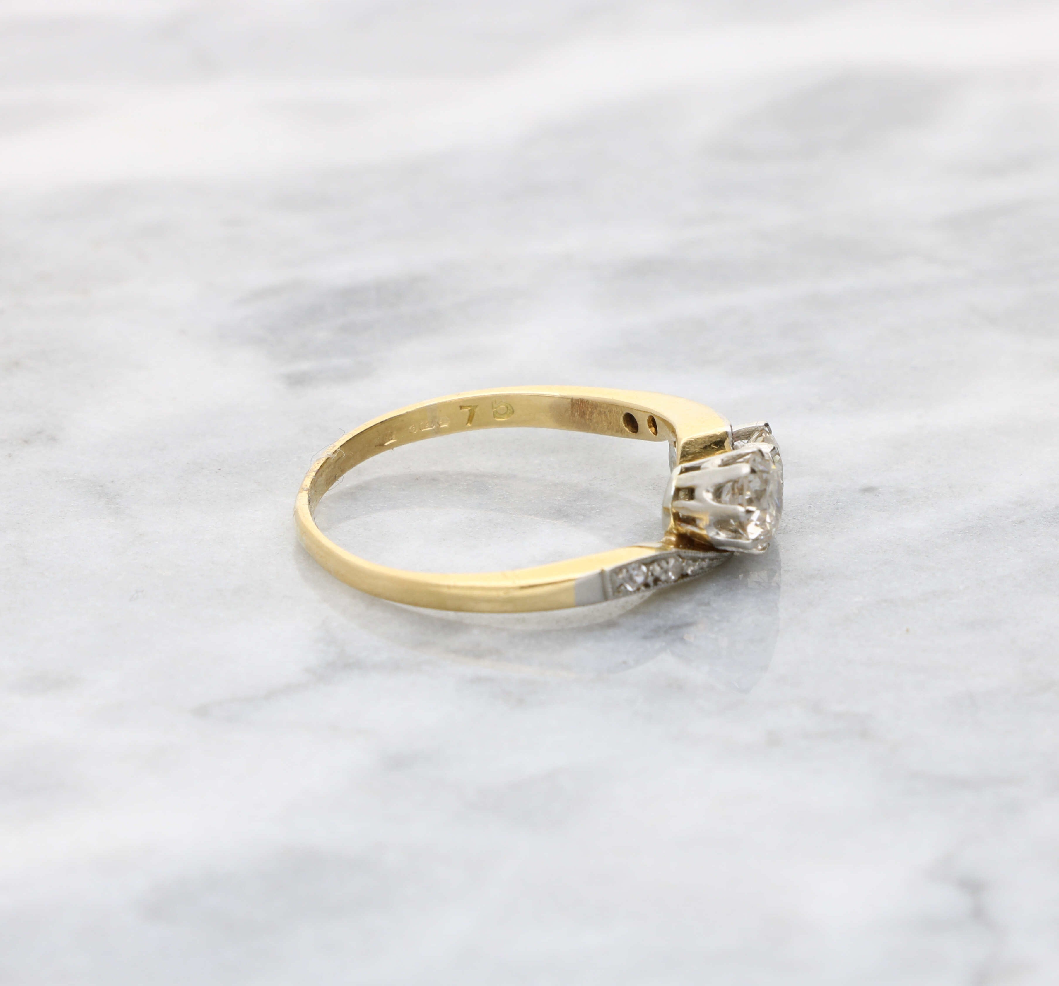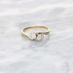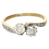 A wonderful yellow gold and platinum diamond crossover ring with diamond-set shoulders.