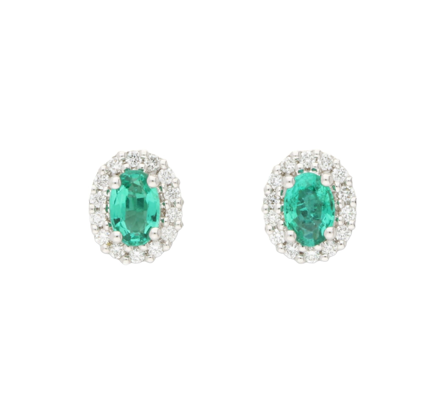 A pair of white gold oval emerald & diamond cluster ear studs.