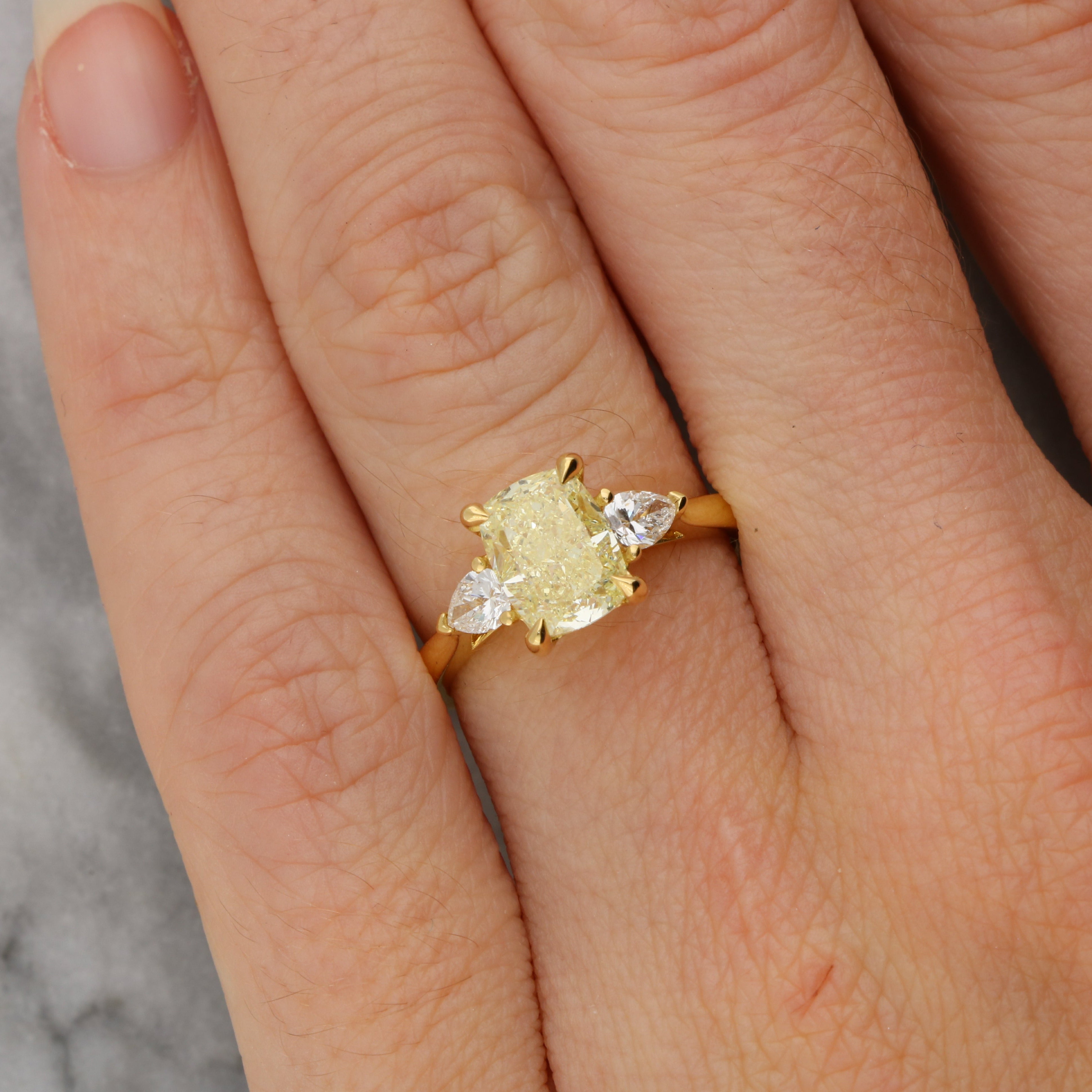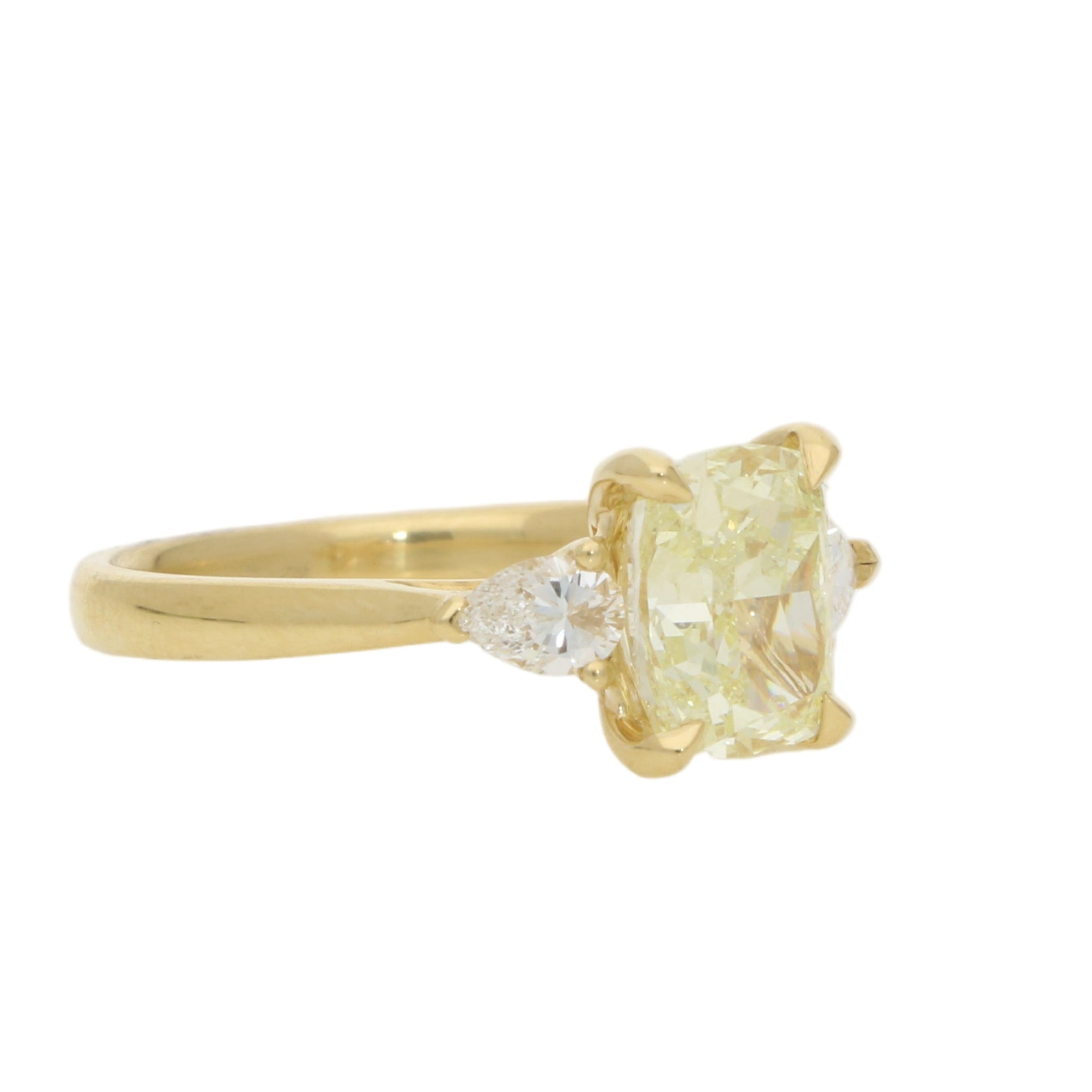- Stone Weight: The central cushion cut diamond is GIA certified as 2.02 carats, fancy light yellow in colour with I1 clarity. There is a combined side diamond weight of 0.30 carats, ranging I-J in colour with VS-SI clarity.
