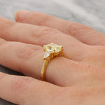 The ring is centrally set with a sparkly elongated cushion cut diamond which is securely four claw set in yellow gold. The diamond is then sided by two perfectly matched pear cut diamonds. The stones are mounted in a wed fit design; meaning the ring can easily be paired with a wedding and/or eternity ring.