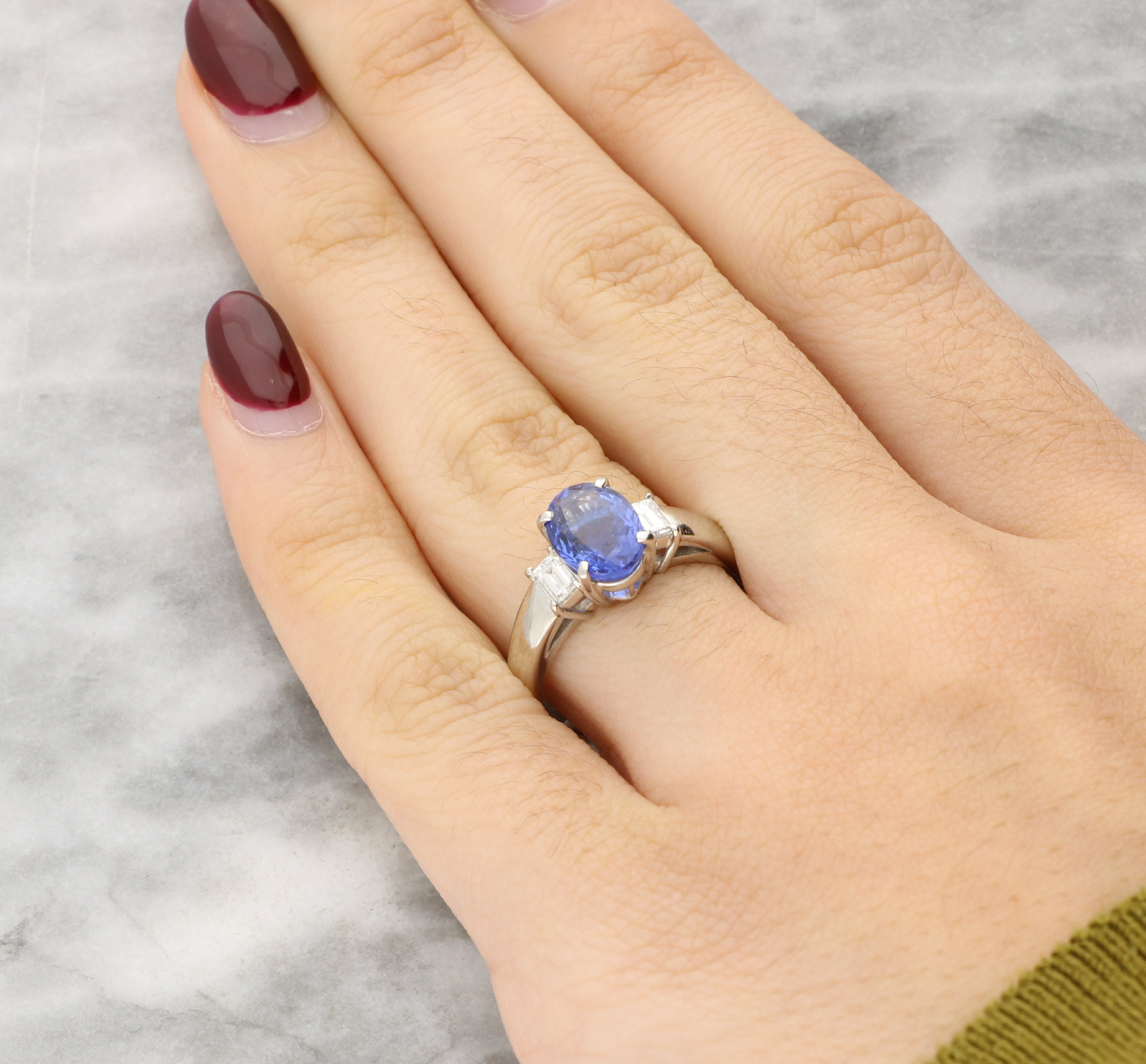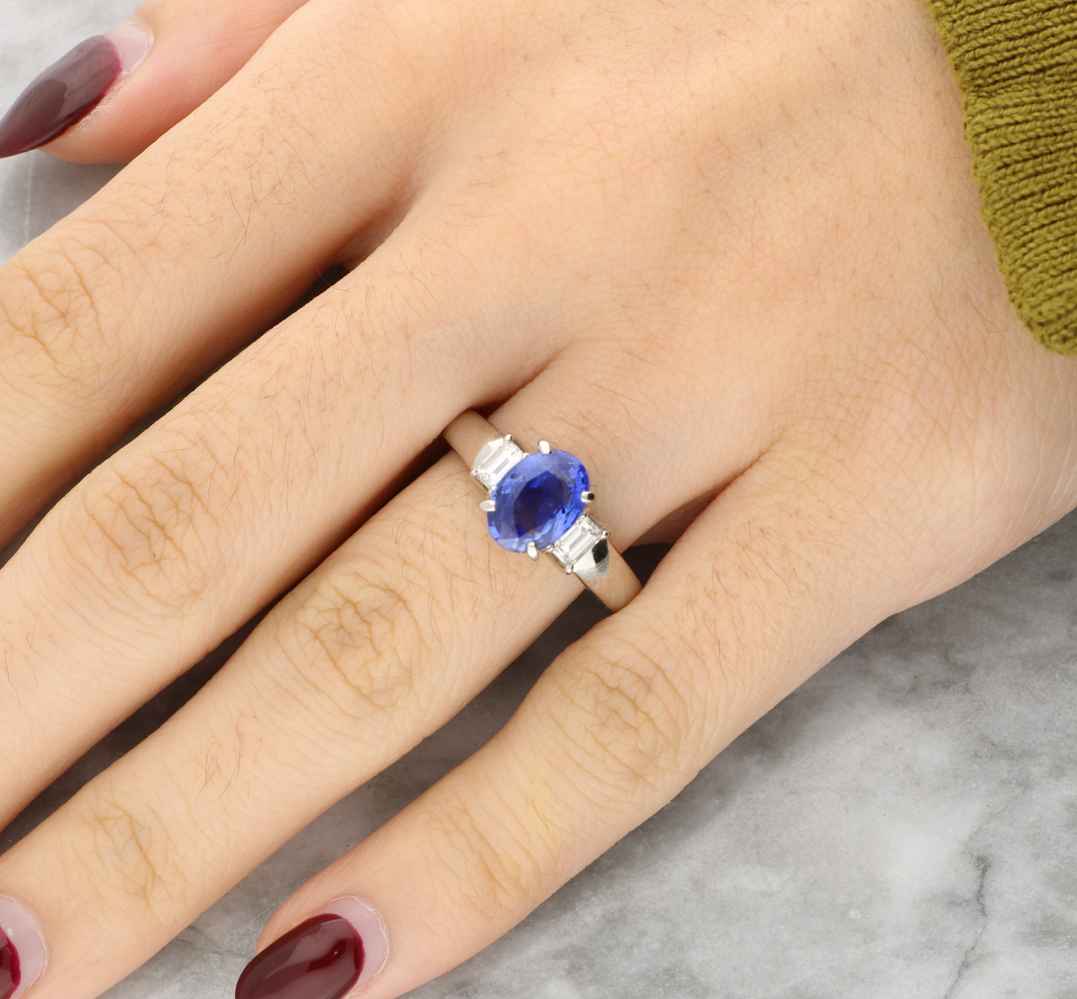 To either side of the sapphire sits a baguette cut diamond, also claw set, creating a refined three stone arrangement across the front of the ring.