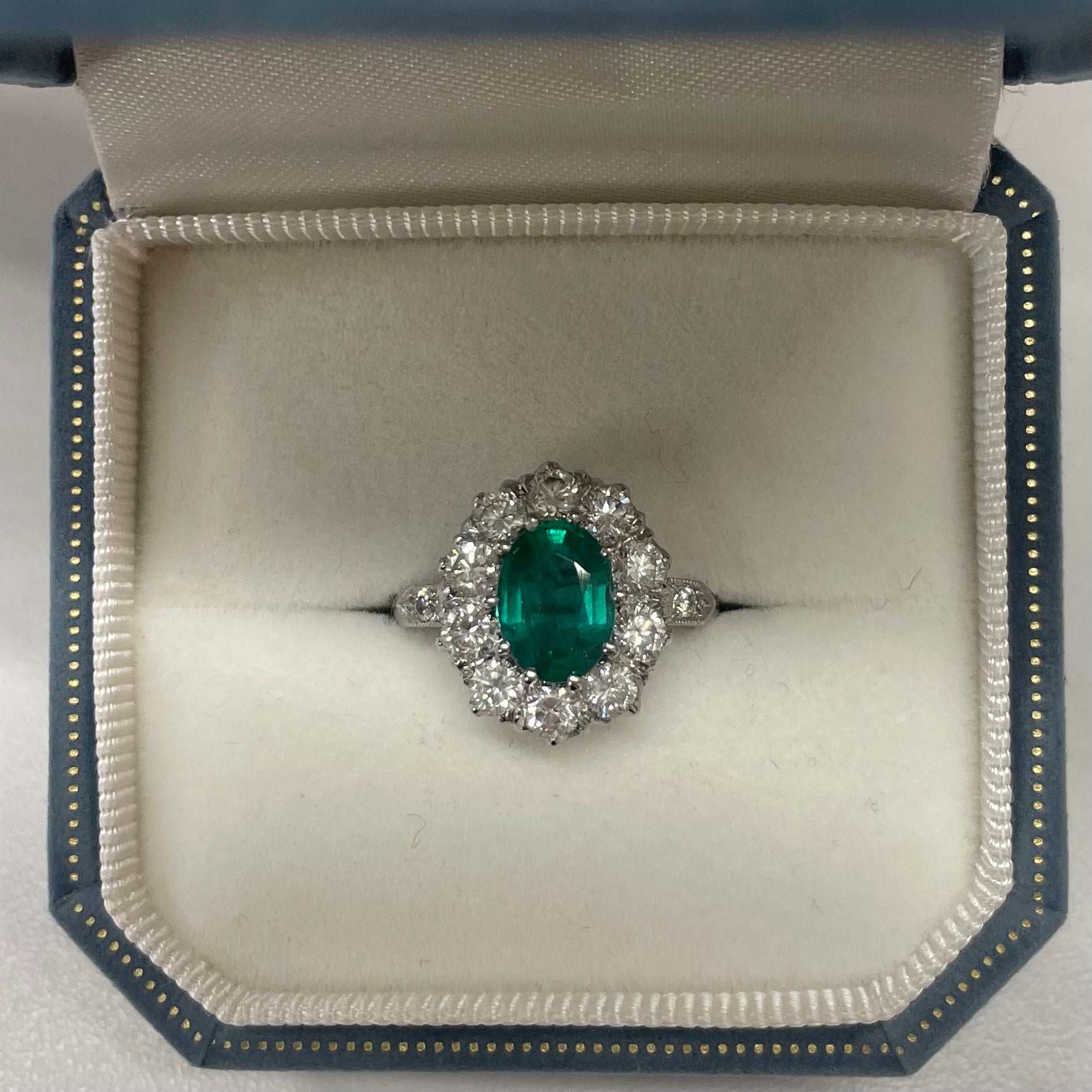 The ring features a centrally set oval emerald, secured by a 10 claw setting and estimated at 1.30 carats. Surrounding the emerald is a cluster of 10 round brilliant cut diamonds, all claw set, with additional diamonds accenting the shoulders. The head of the ring leads to a solid platinum band.