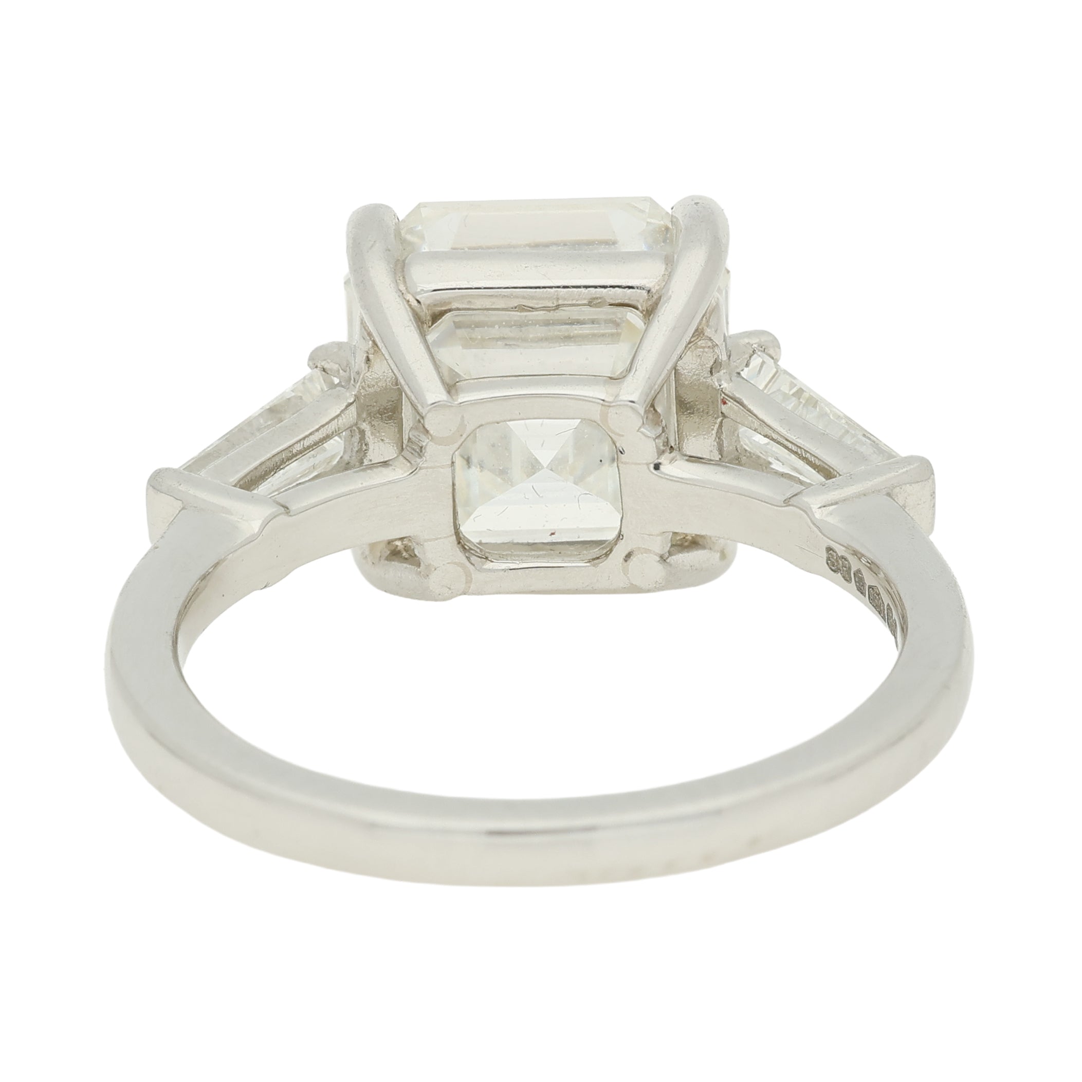 At the centre of this ring sits a beautifully proportioned 5.07 carat asscher cut diamond, held securely by four claws. Flanking the central stone are tapered baguette cut diamonds set horizontally on each shoulder, creating an Art Deco inspired silhouette. The clean lines of the baguettes perfectly complement the geometry of the asscher cut. The head of the ring leads to a solid platinum band.