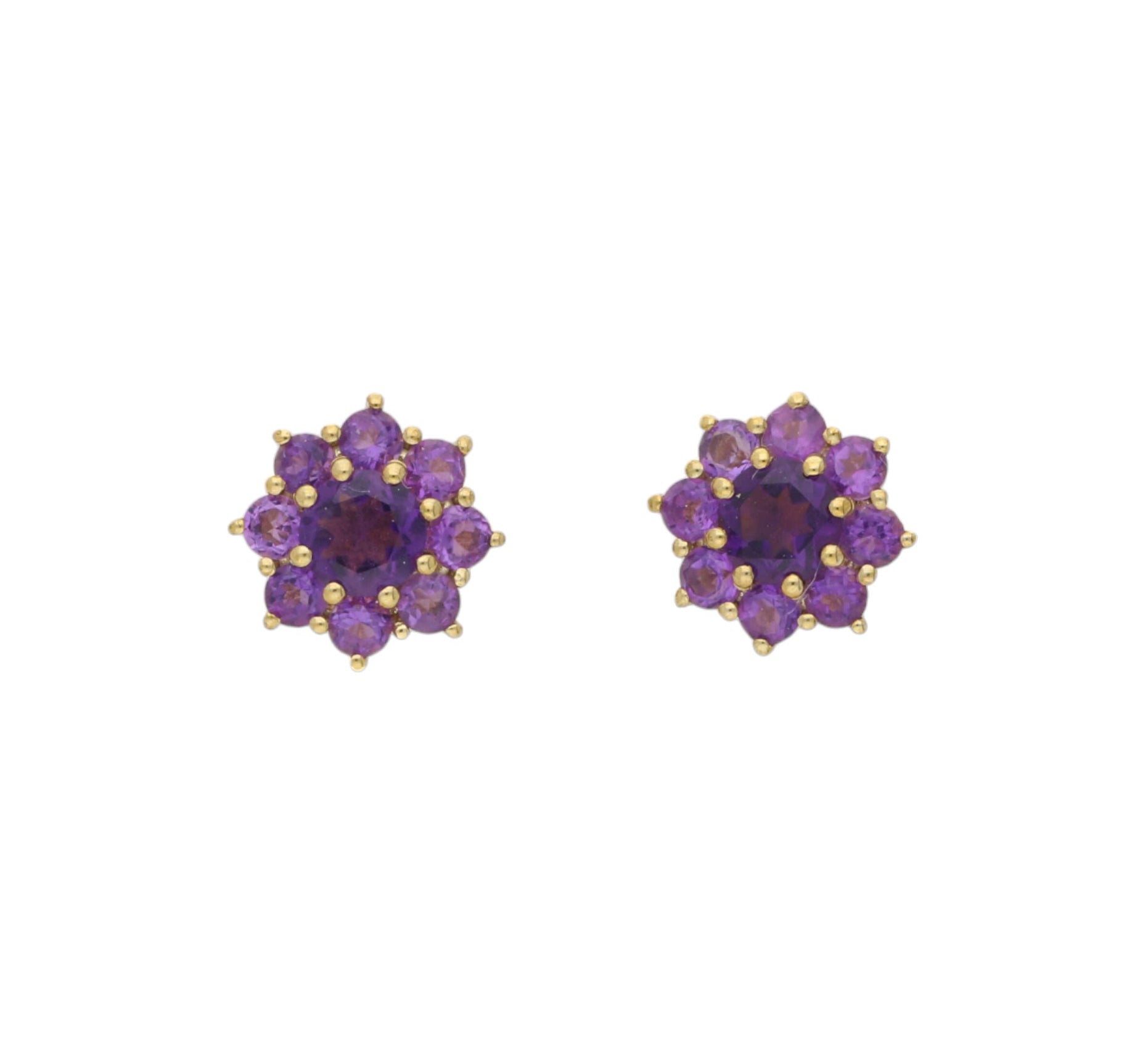A pair of yellow gold amethyst cluster earrings.