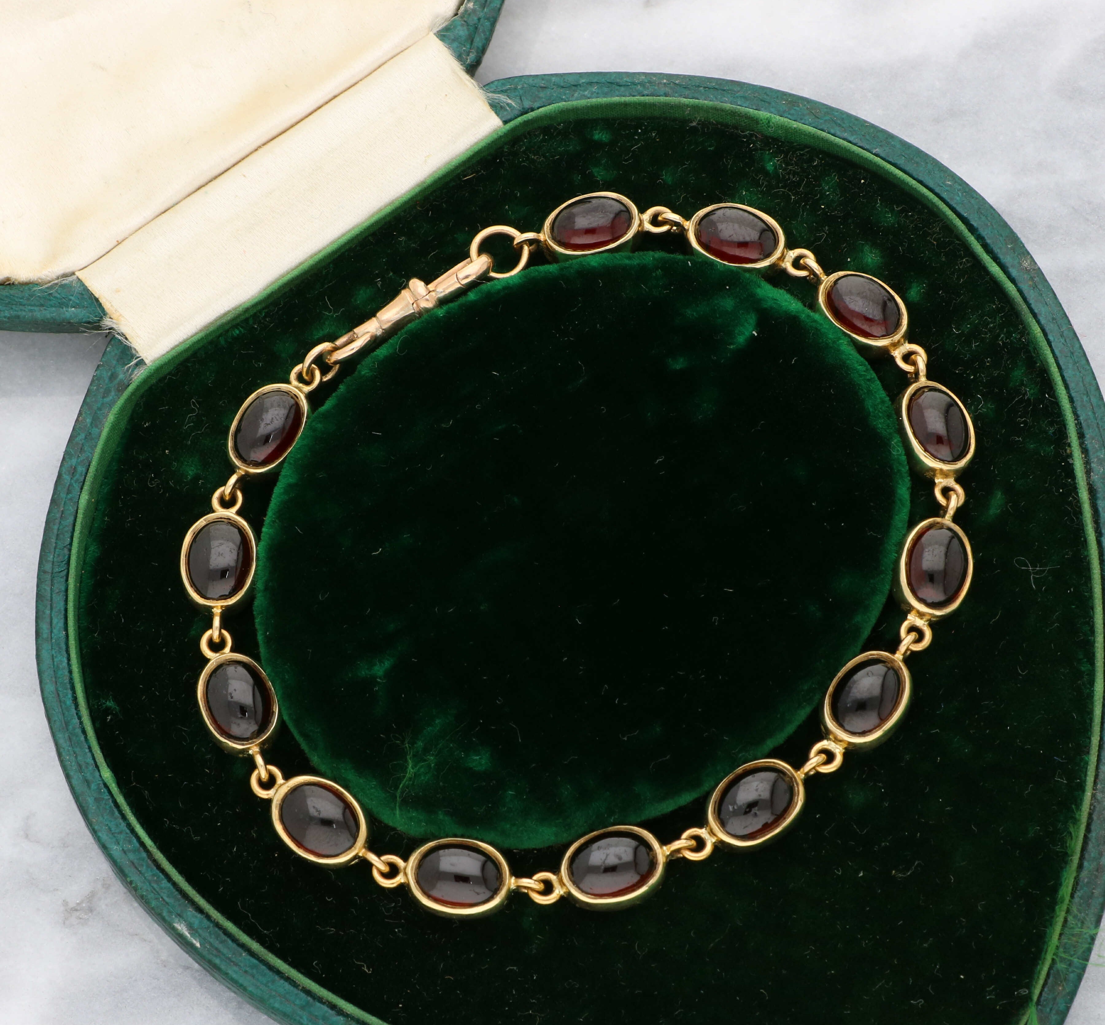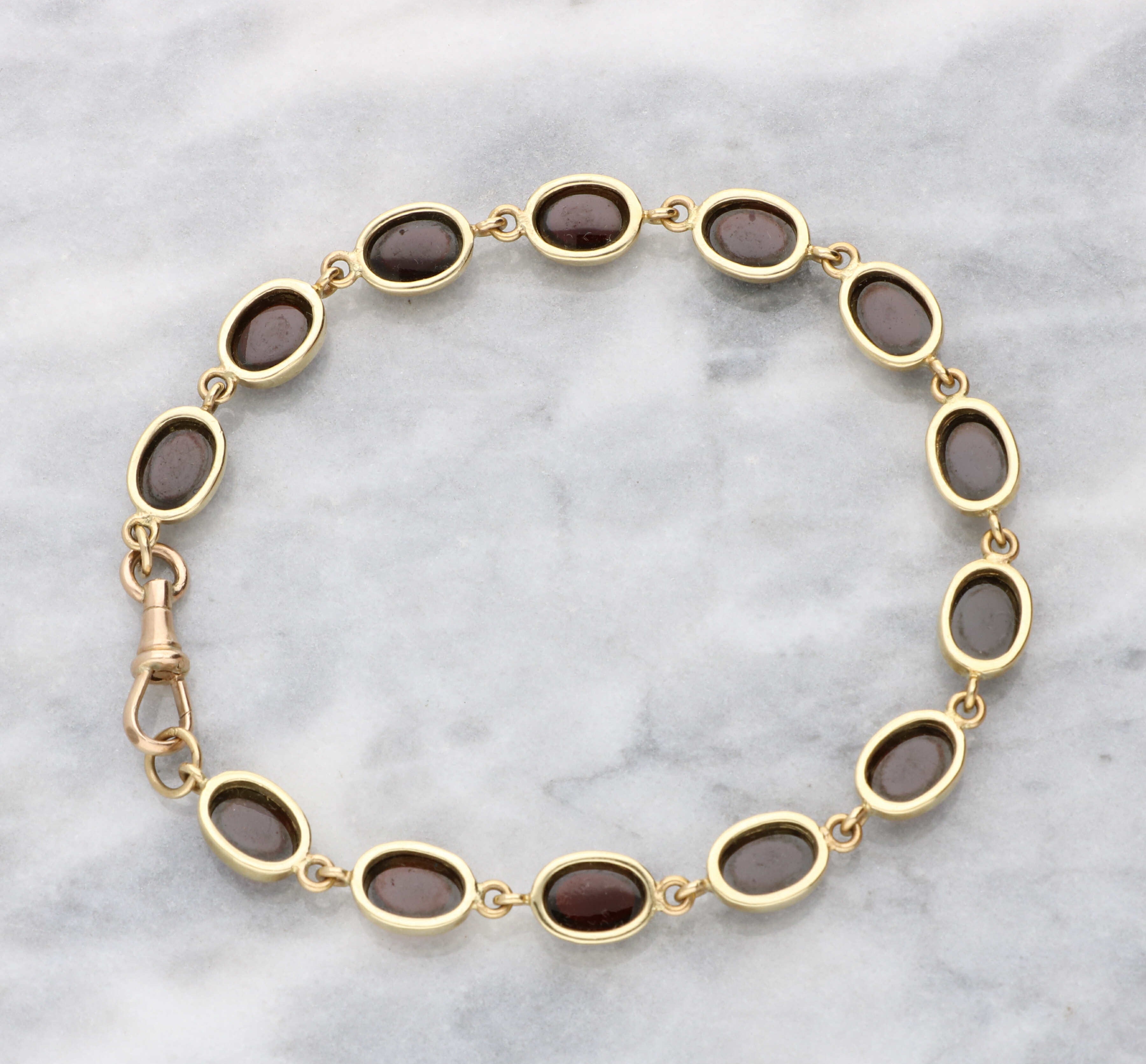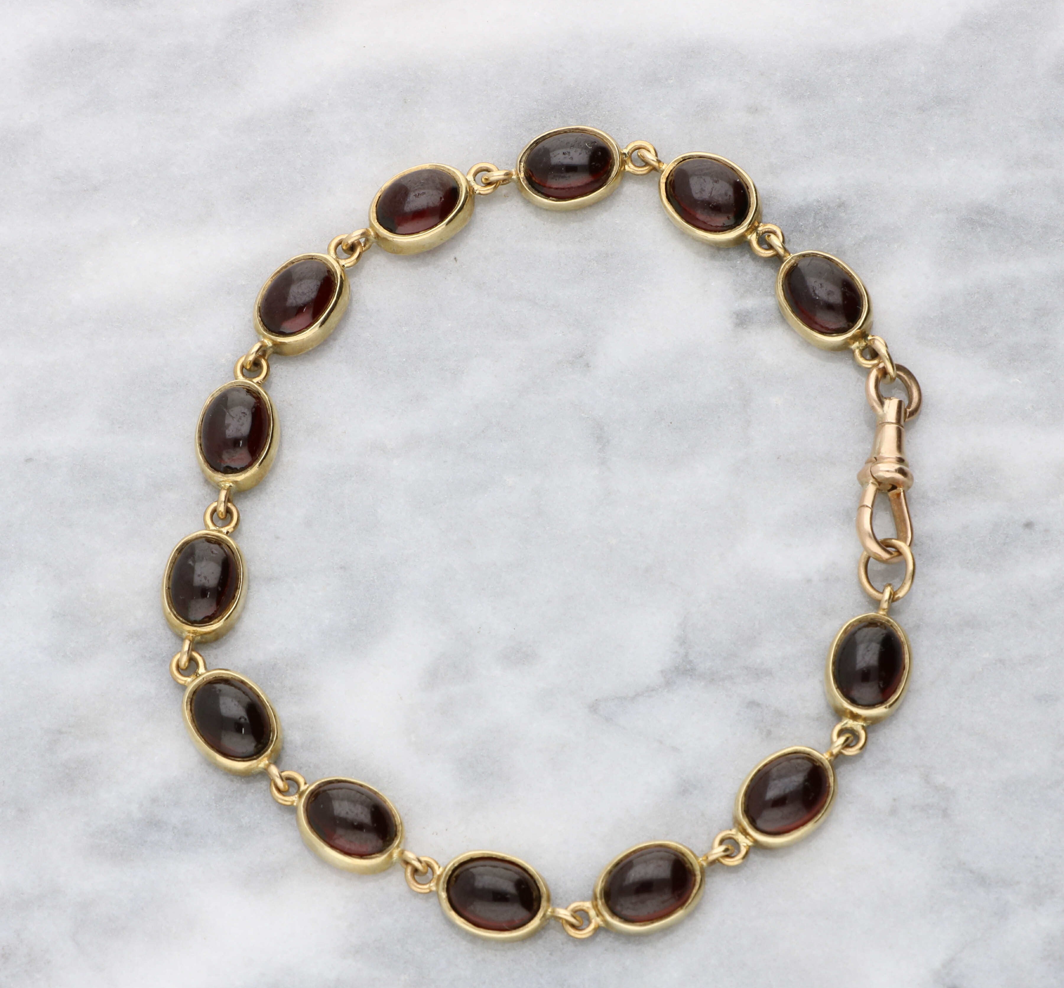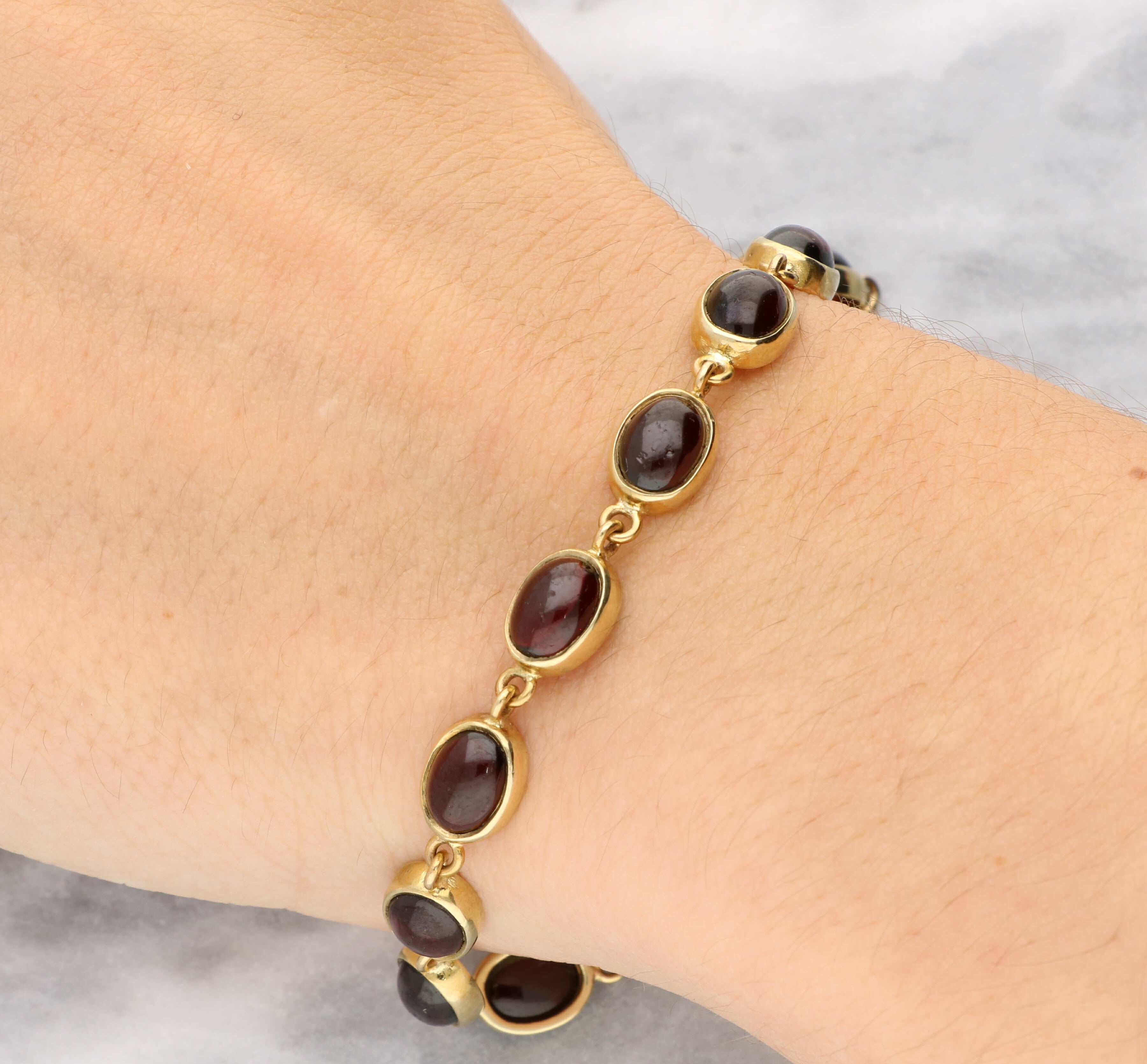 Dimensions: The bracelet features 13 9x7mm cabochon garnets and measures 7.75 inches in length.