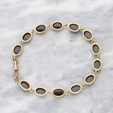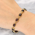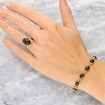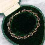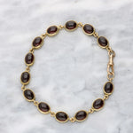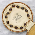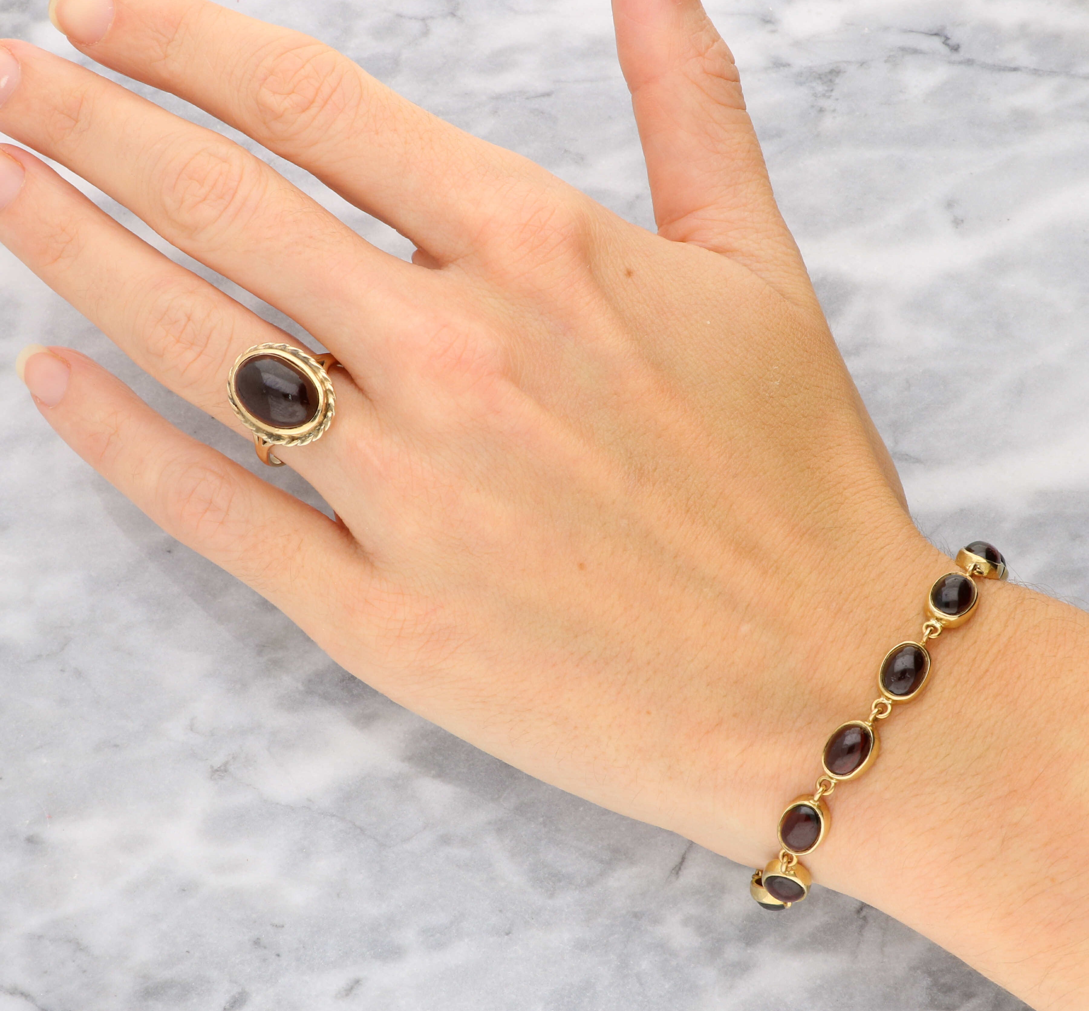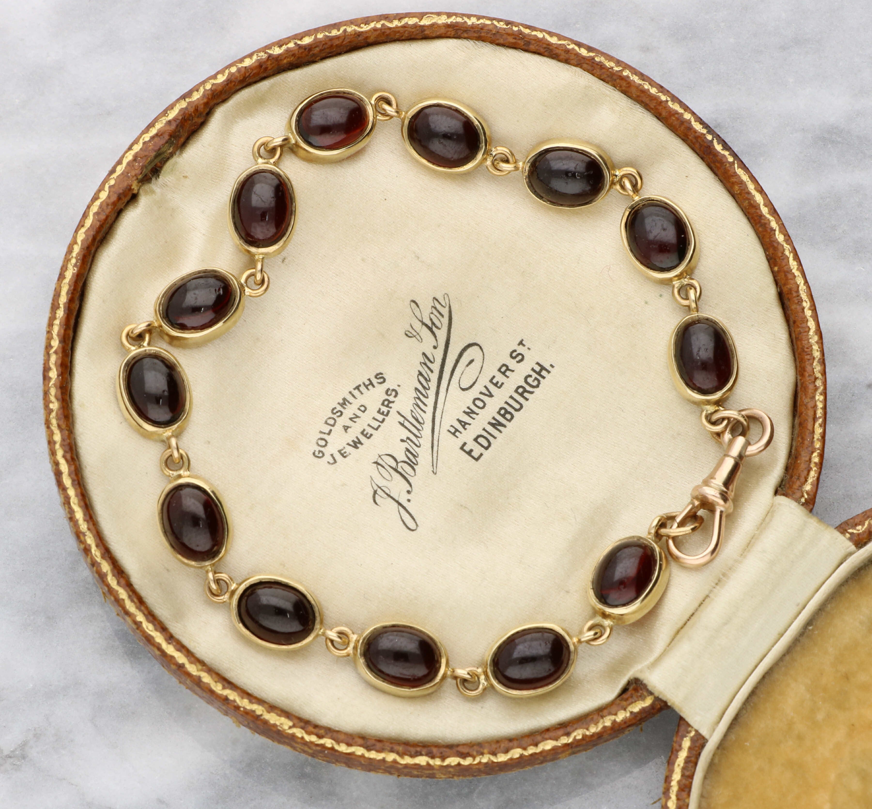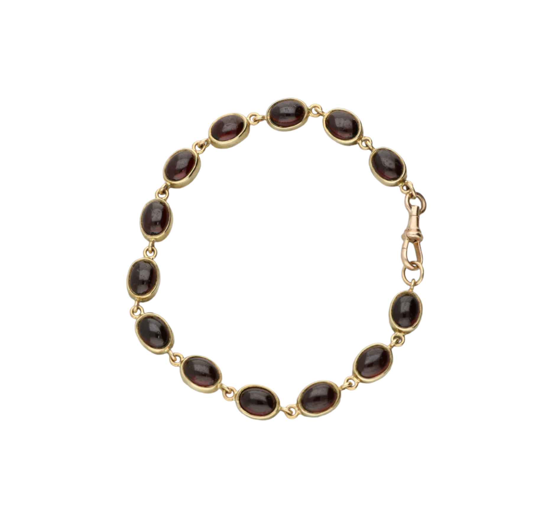 Dimensions: The bracelet features 13 9x7mm cabochon garnets and measures 7.75 inches in length.