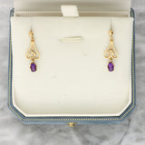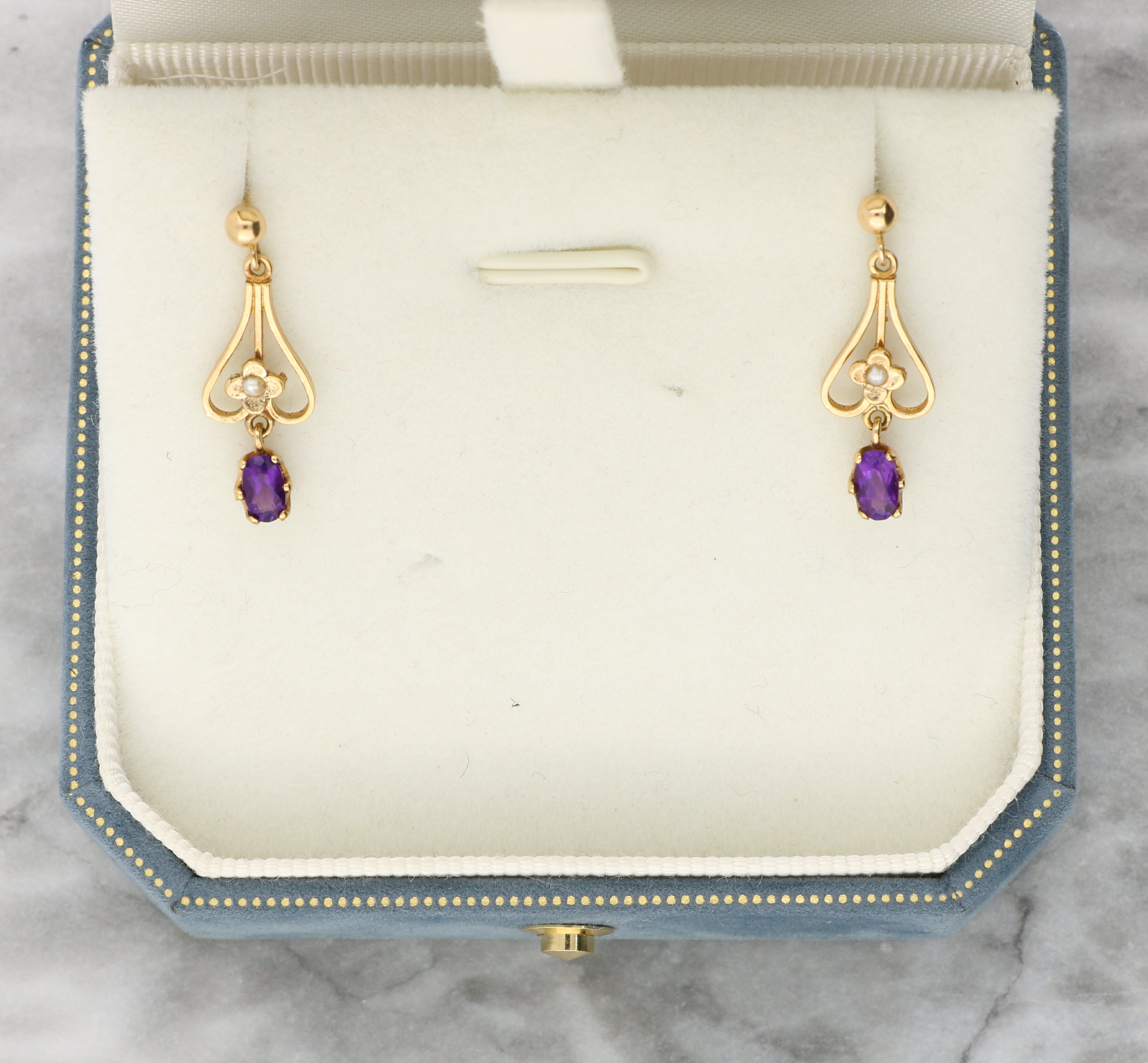 These earrings are set in 9ct yellow gold and features a round seed pearl at the centre of of the delicate openwork frame. The pearl is set in a floral motif, within the fine gold surround. A rich purple oval amethyst sits suspended from the lower section of the earrings, adding delicate movement to the piece. The amethyst is securely set with six claws.
