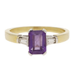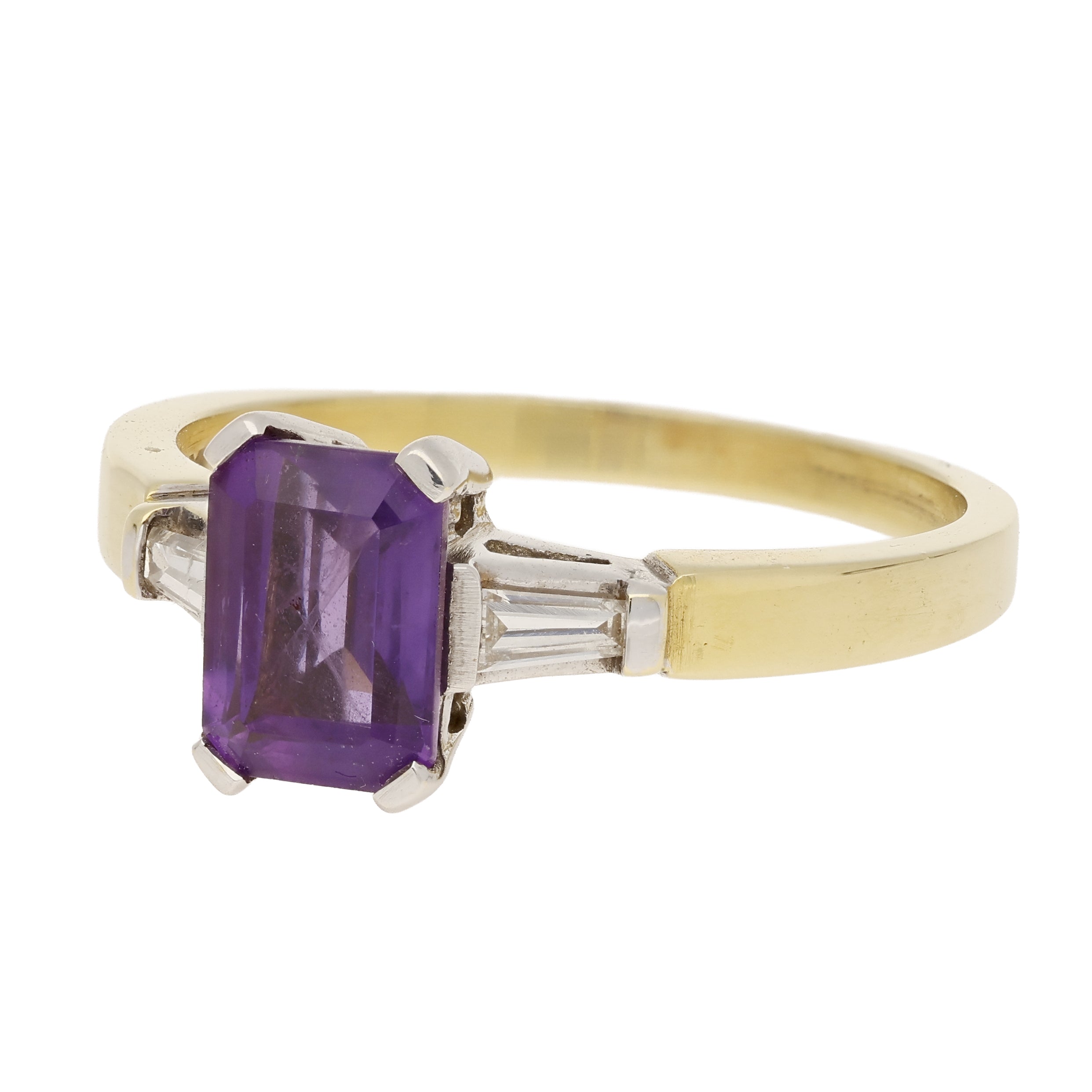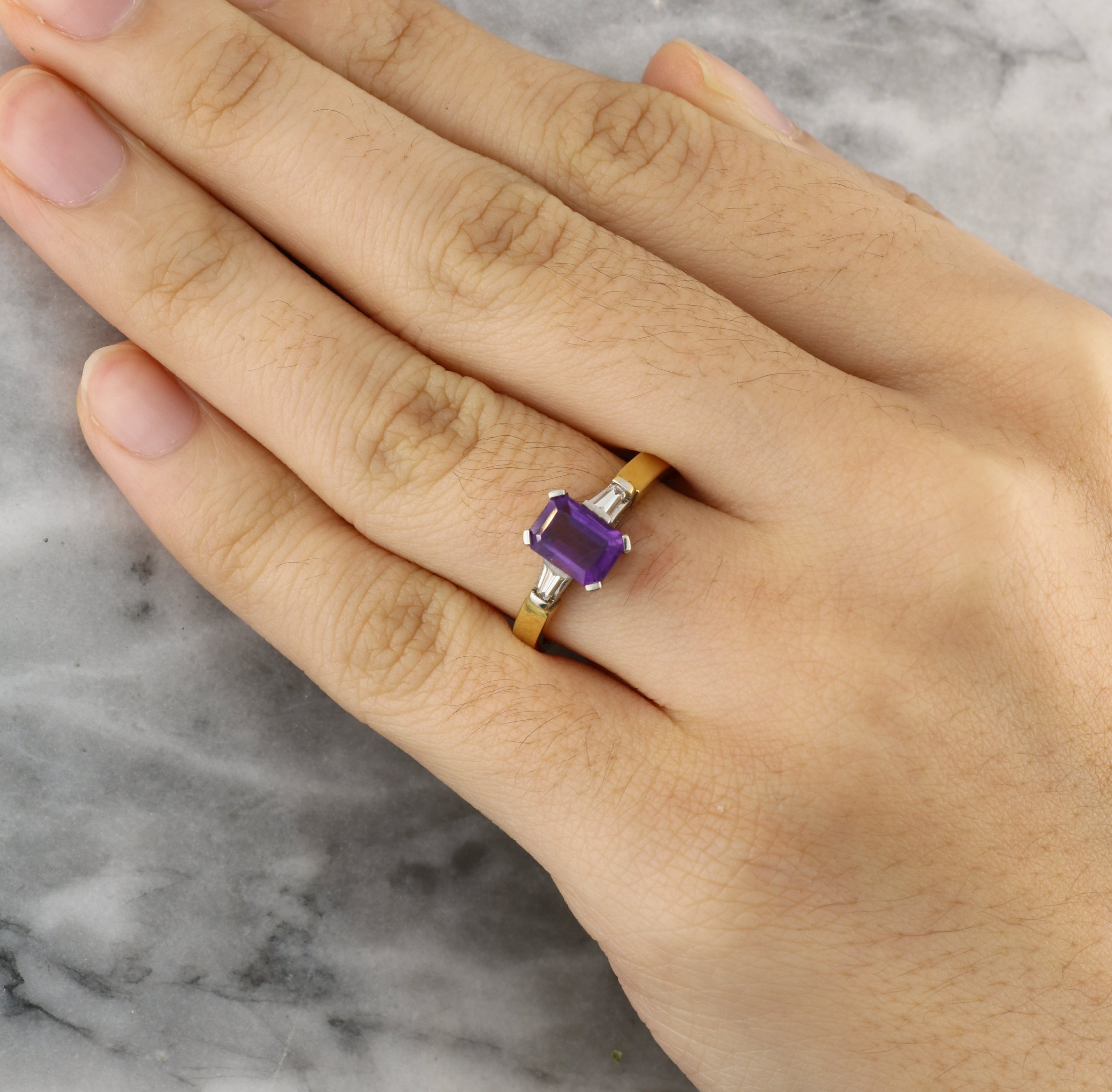 This striking ring features a central emerald cut amethyst, which is securely four claw set. Flanking the central stone are two tapered baguette cut diamonds. That complement the bold colour of the amethyst. The head of the ring leads to a solid 18ct gold band.