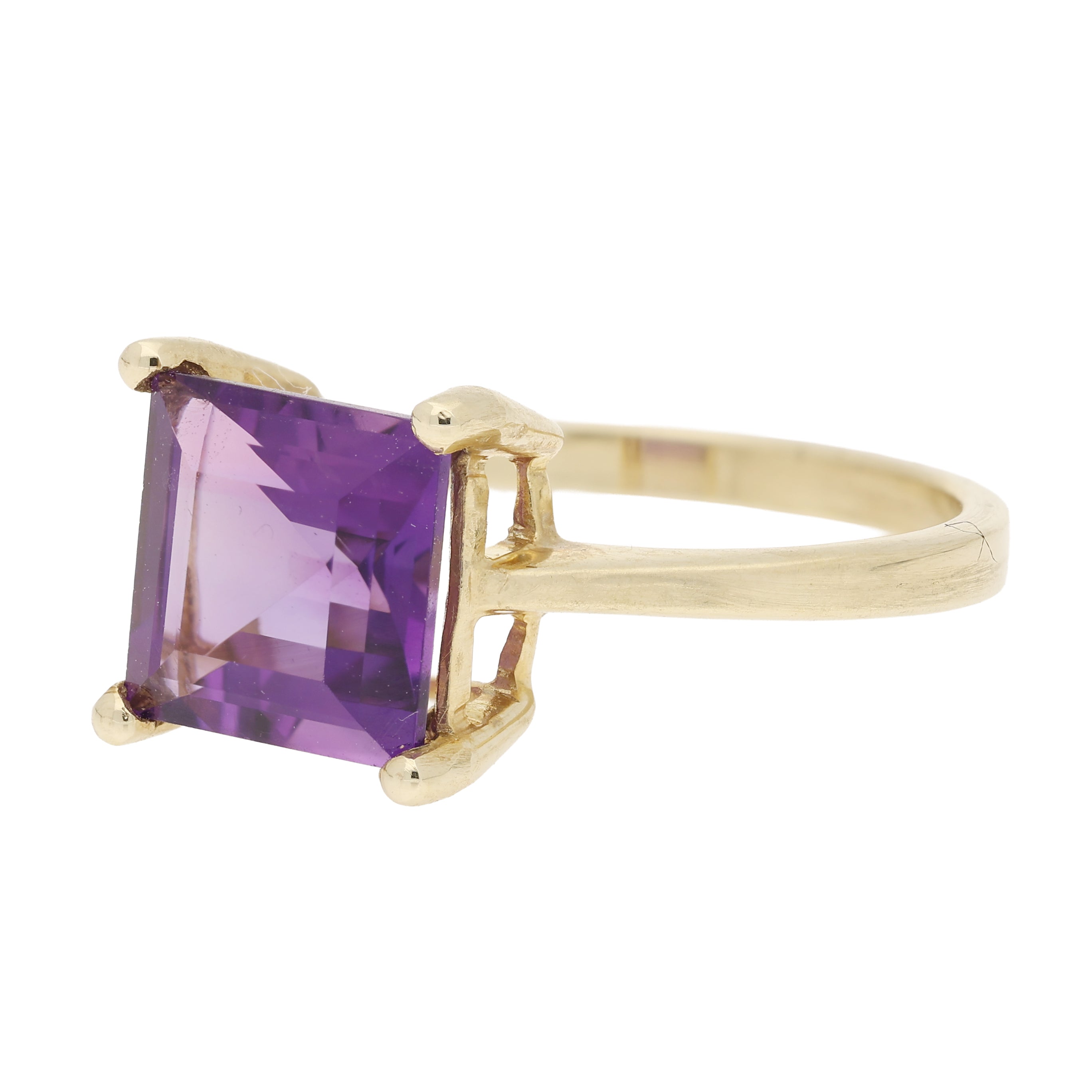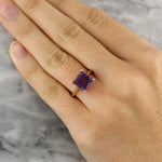 This striking ring features a single square cut amethyst, in a gold setting. The stones deep purple hue is bright and striking, catching the light; showcasing the stone’s crisp facet work and clarity.