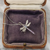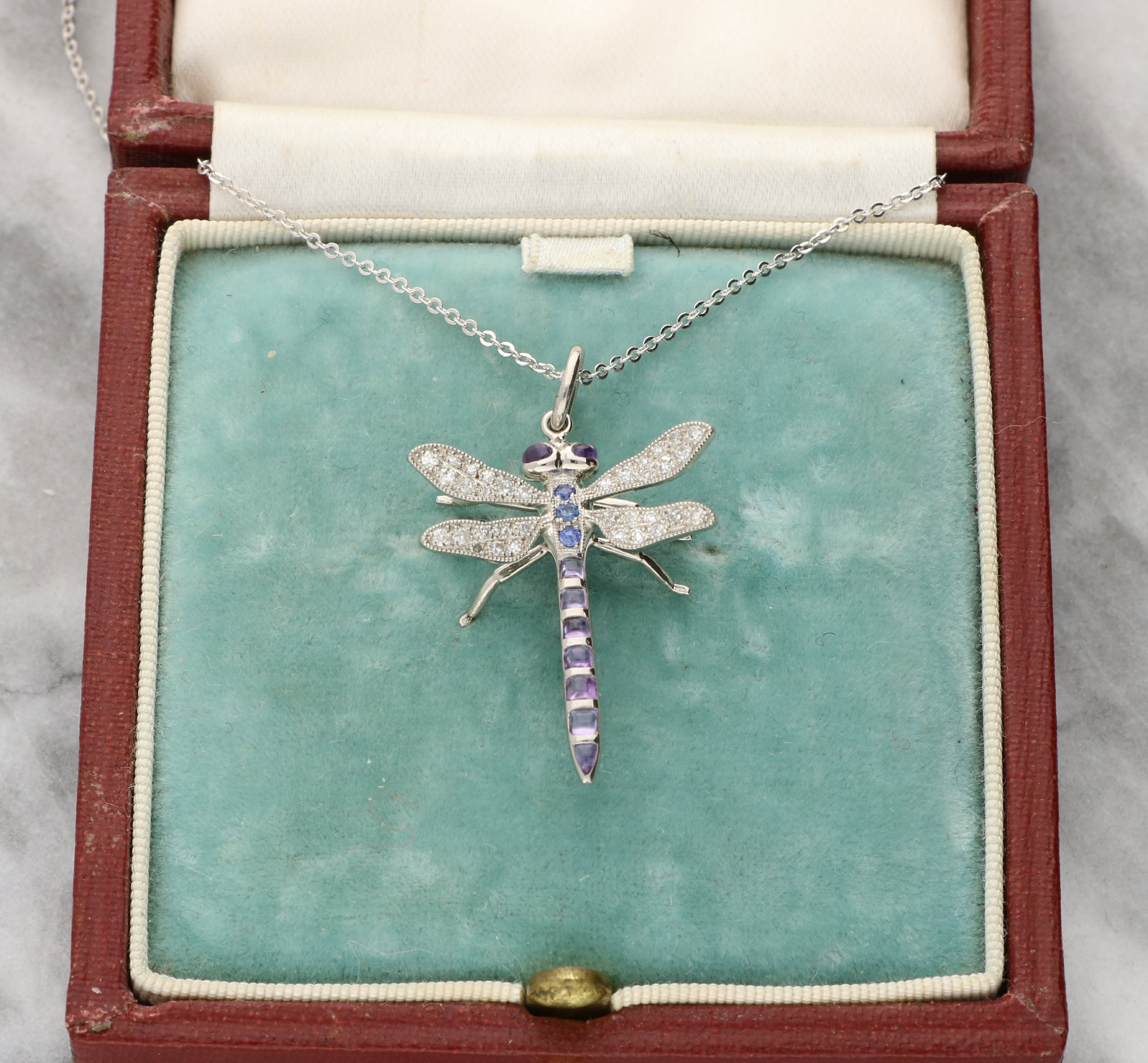 Vintage inspired amethyst, sapphire and diamond dragonfly insect pendant set in platinum