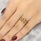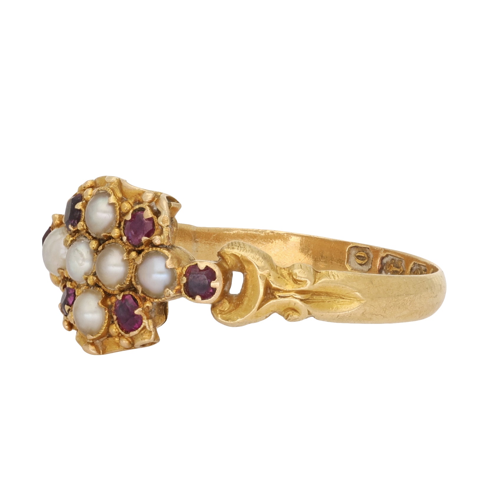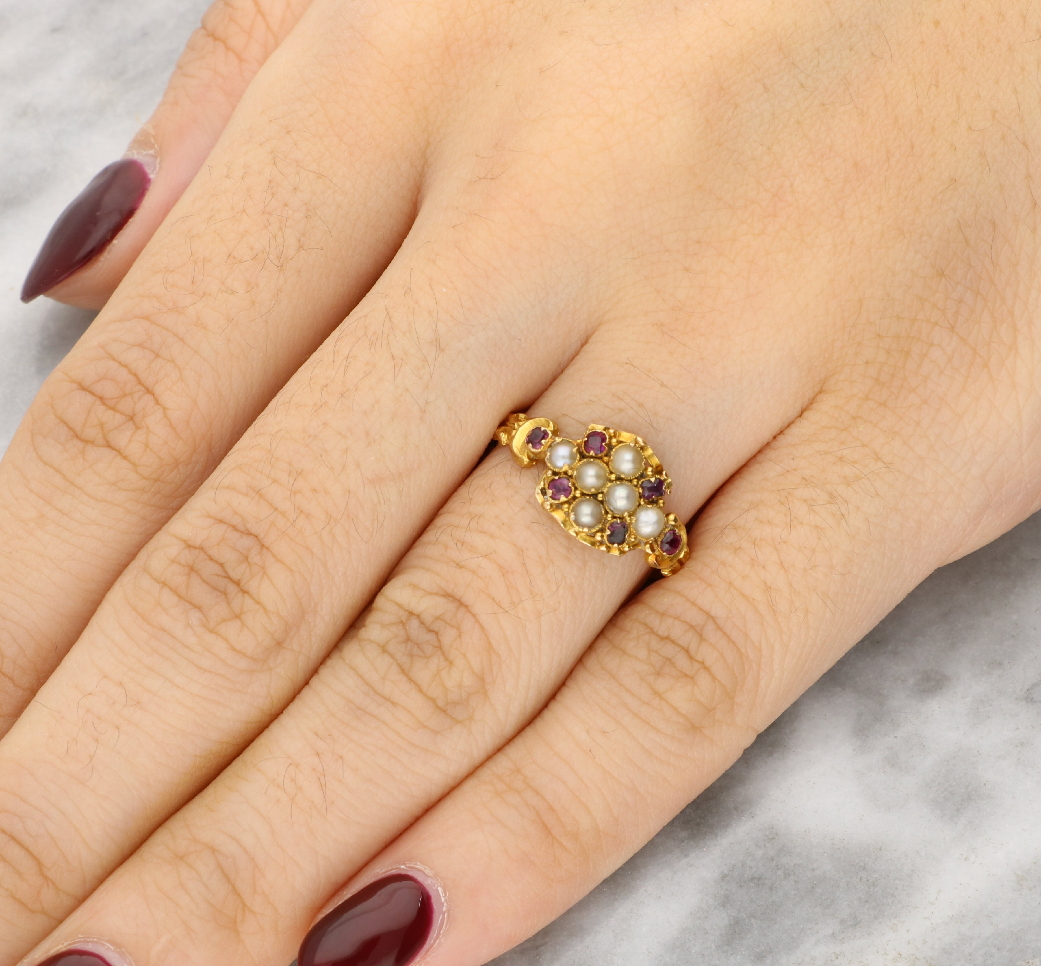 A unique antique ruby, diamond and pearl ring set in 18k yellow gold.