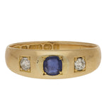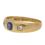 This lovely ring is set in yellow gold and features a central oval cut blue sapphire. To either side of the sapphire is a round old cut diamond, creating a three stone arrangement across the front of the ring.