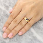 The stones sit flush within the gold, allowing the focus to remain on the deep blue sapphire while the diamonds add contrast to the design.