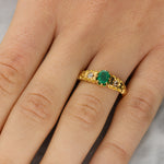 The ring centrally features an oval cut emerald which is securely eight claw set. The emerald is flanked by a star set old cut diamond on either side. The shoulders of the ring are beautifully engraved, showcasing the fine craftsmanship of the early 20th century. The head of the ring leads to a solid 18ct gold band.