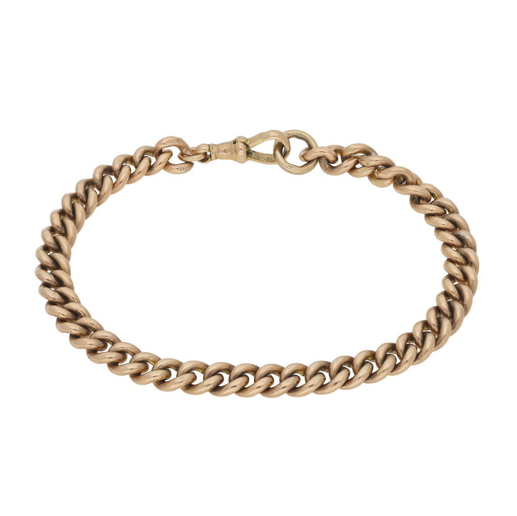 The bracelet boasts a beautiful warm rose gold tone. Each solid link is stamped 9K, reflecting the exquisite attention to detail characteristic of antique jewellery. It is secured with a classic dog clip clasp, prized for its durability and ease of use.