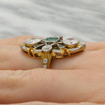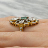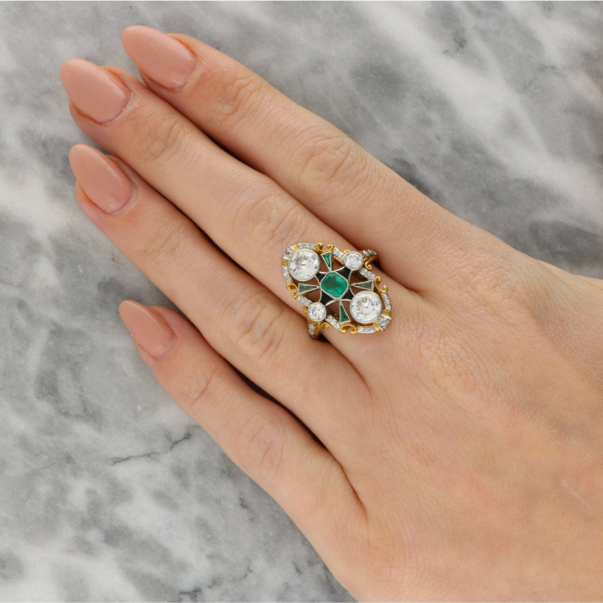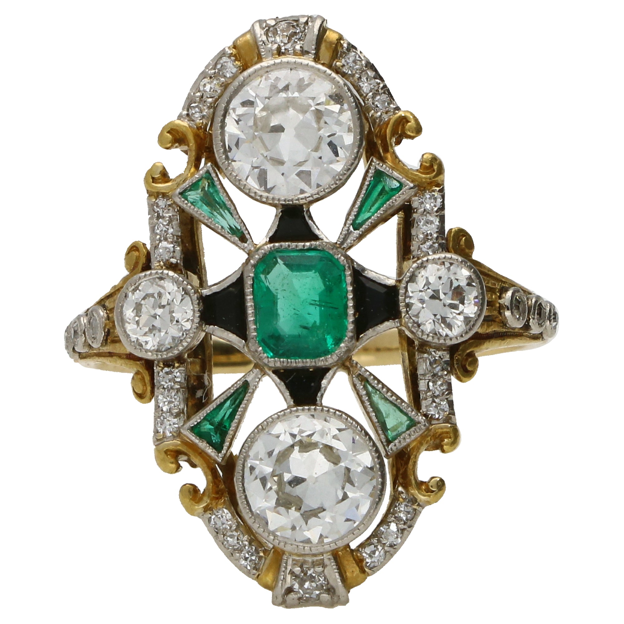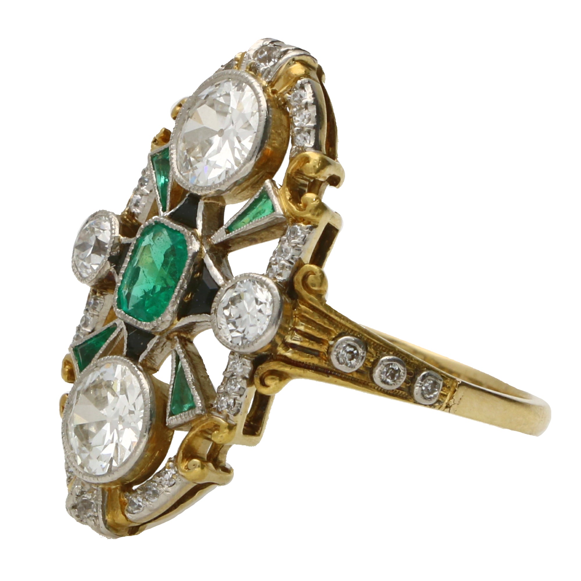 The ring is centrally set with a cushion cut emerald which is surrounded by platinum openwork with onyx and further emerald panels. The ring is set to the top and sides with an old cut diamond and bordered by scrolled gold work and smaller diamonds. The shoulders are scrolled and set with three graduating old cut diamonds.