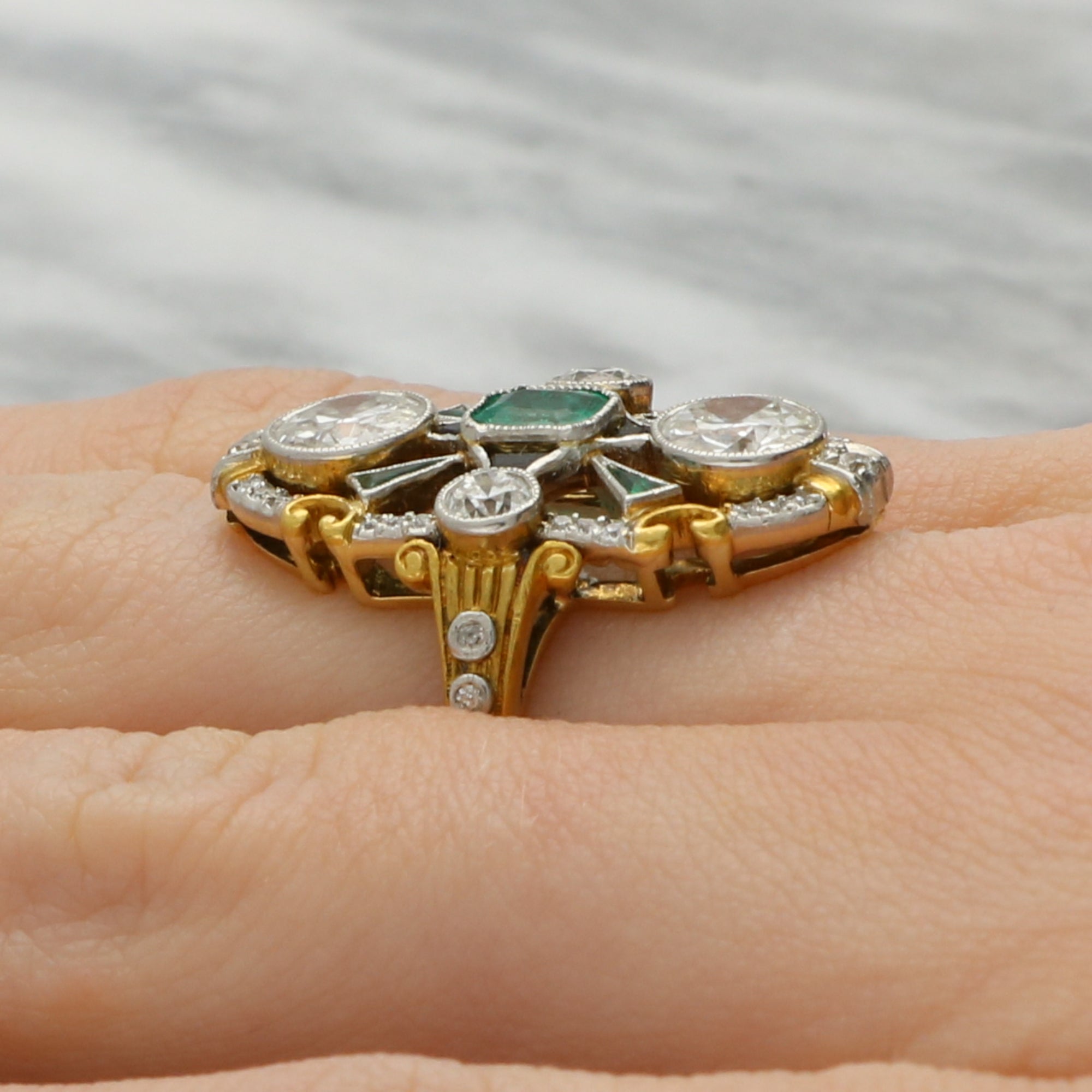 For size reference the head of the ring measures 1.5 x 2.5 centimetres and there is a gross weight of 6.3 grams. There is an estimated emerald weight of 0.35 carats. There is a estimated total diamond weight of 1.70 carats ranging J-K in colour with VS-SI clarity. The ring is currently a UK finger size O 1/2 but can be resized for a perfect fit. Due to the age the ring is not hallmarked however has been tested for 18k gold and platinum.