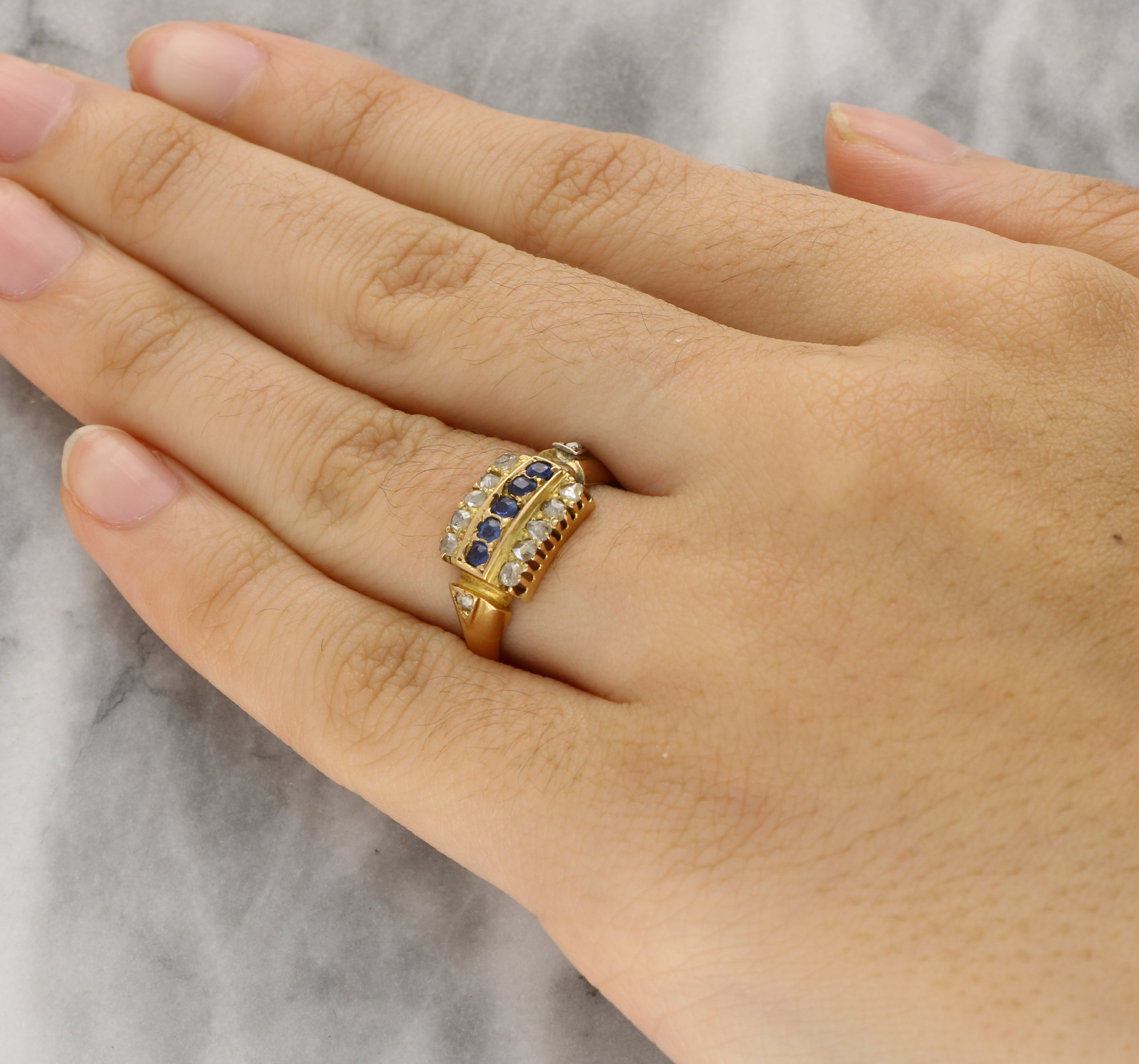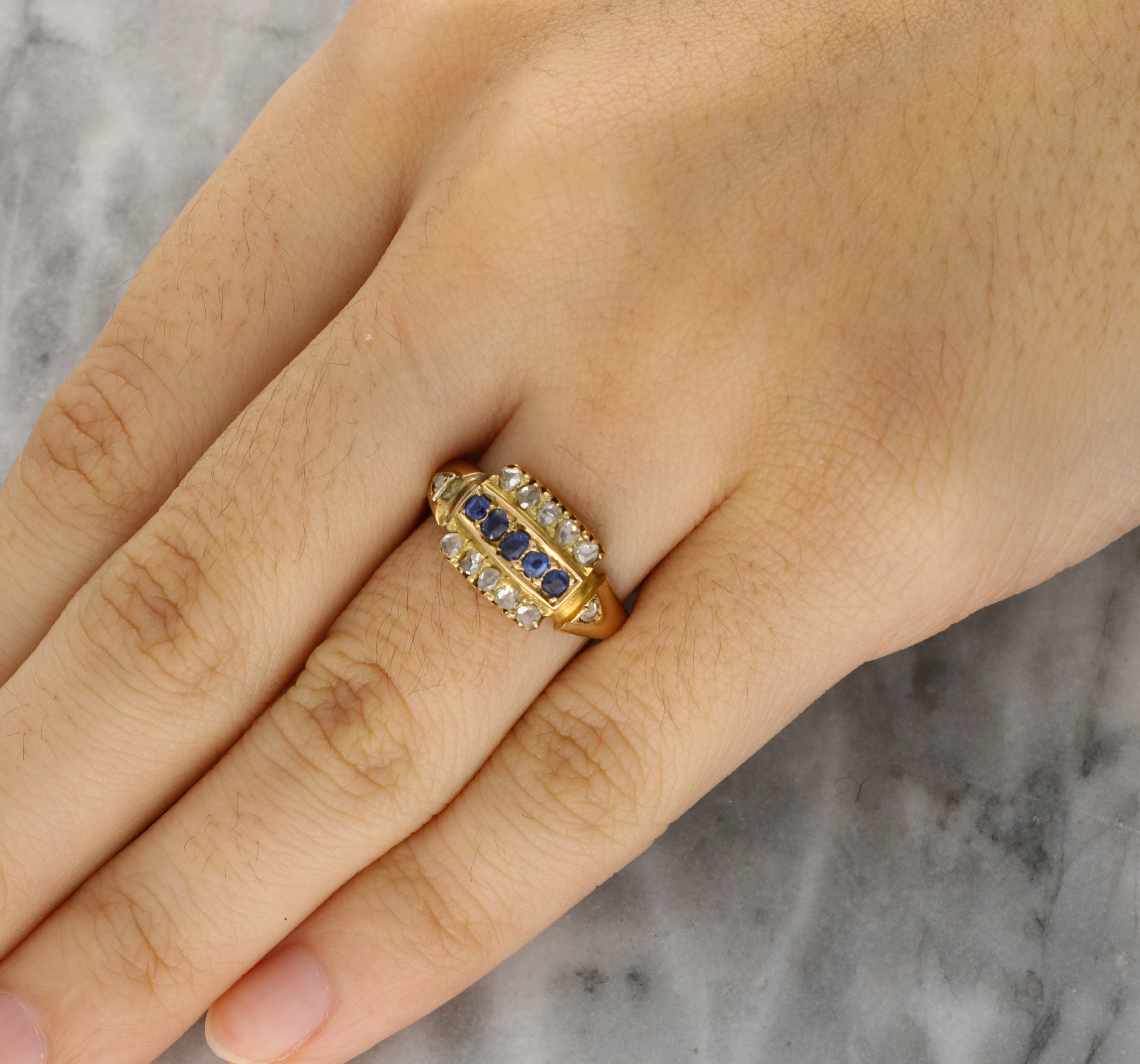 This striking antique ring is crafted in rich 15ct yellow gold and features a bold rectangular panel design, characteristic of late Georgian to early Victorian jewellery. At the centre is a horizontal row of five blue sapphires. Flanking the sapphires above and below are two rows of old-cut diamonds, each individually set in gold. The shoulders are further accented with additional diamond-set details, creating a sense of architectural depth across the ring.