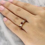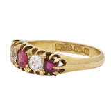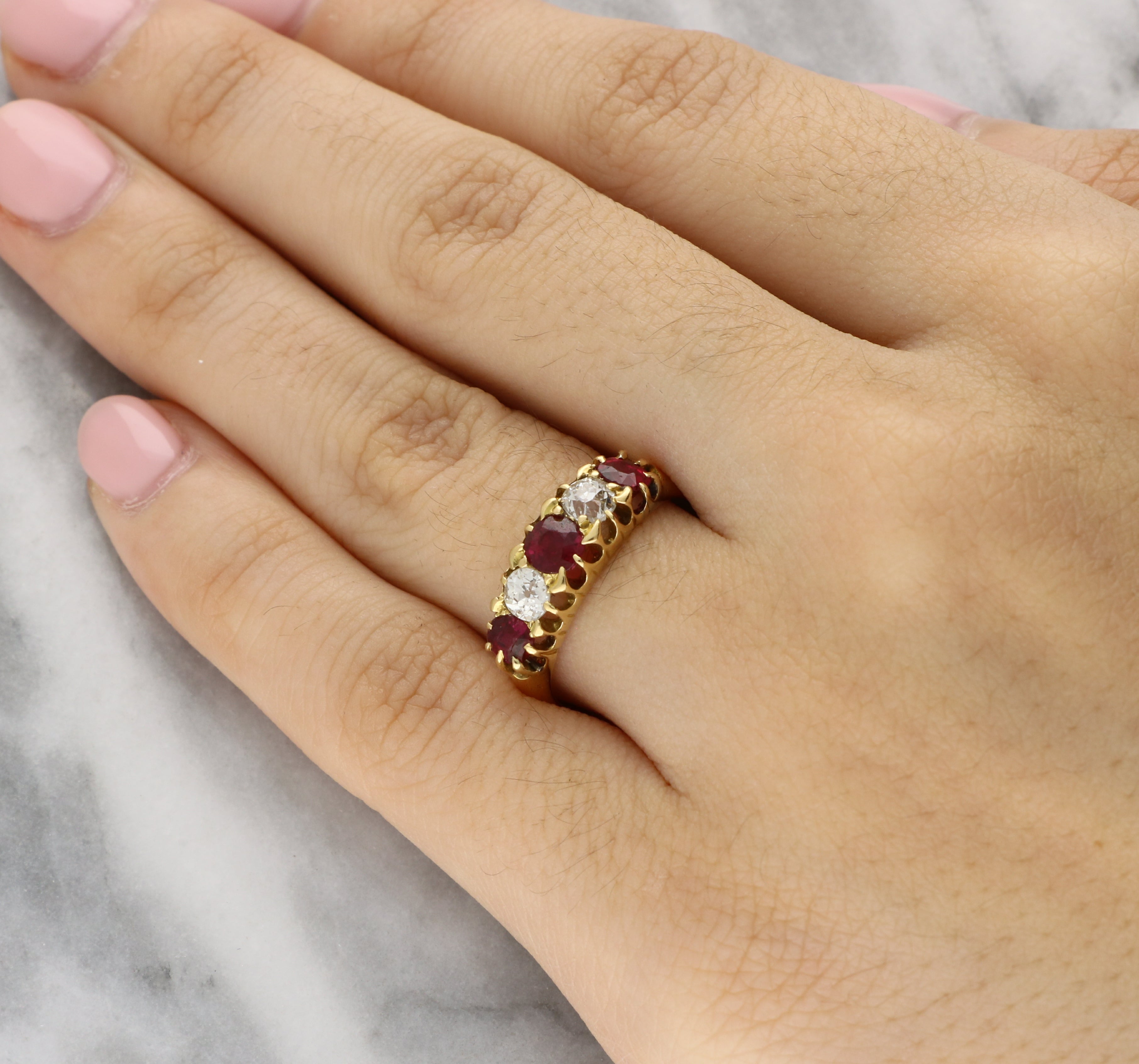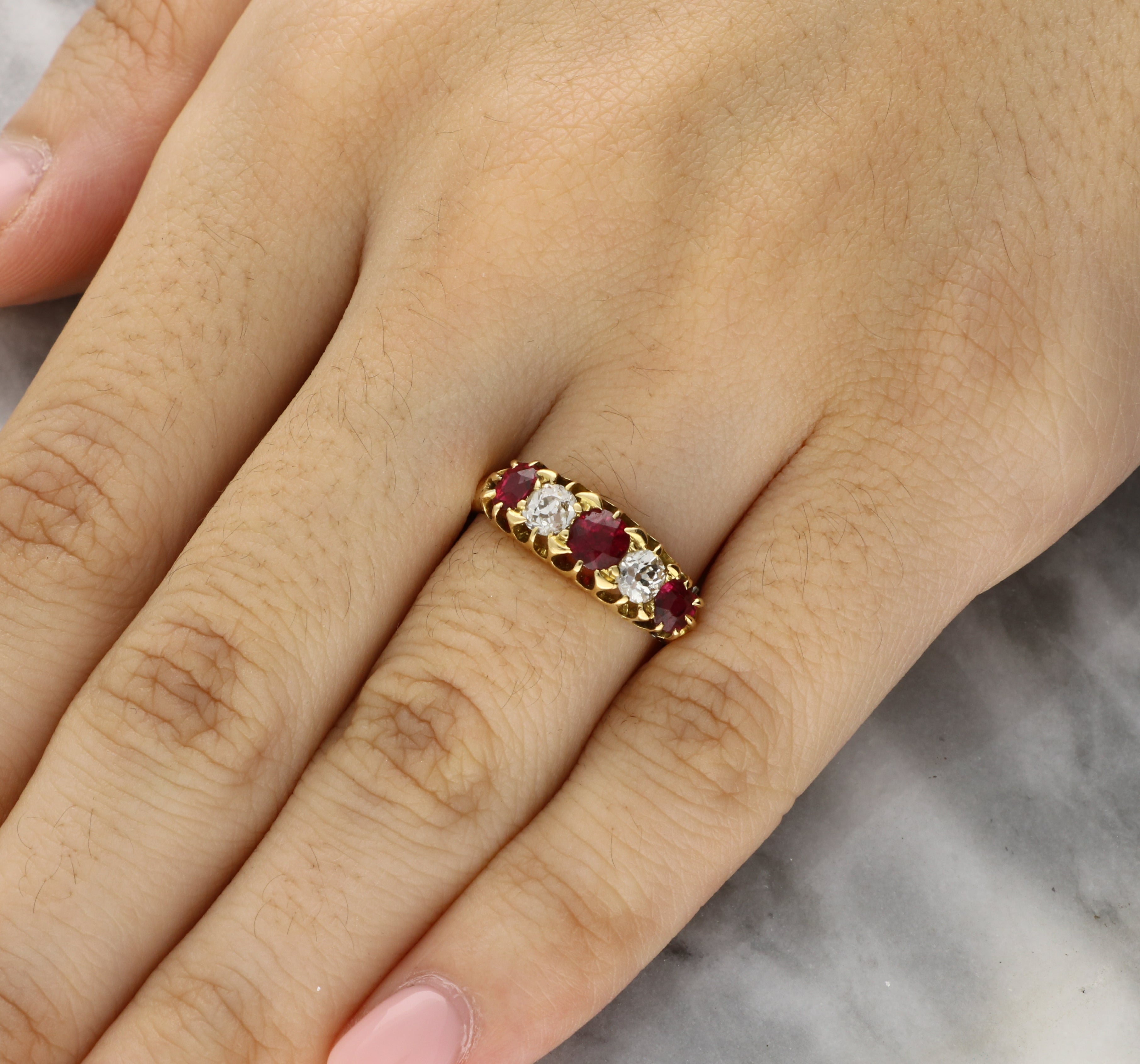 This striking five-stone ring is crafted in 18K yellow gold and set with a central round-cut ruby, flanked by two old-cut diamonds and two additional rubies. The alternating arrangement of richly coloured rubies and bright white diamonds creates a beautifully balanced design, while the traditional claw settings allow each stone to catch the light with maximum brilliance.