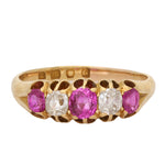 This beautiful yellow gold ring features a classic five-stone arrangement, set with alternating vibrant pink rubies and old-cut diamonds. The softly rounded, hand-cut facets of the diamonds and the rich raspberry hue of the rubies give the ring a warm, candlelit sparkle typical of antique jewellery.