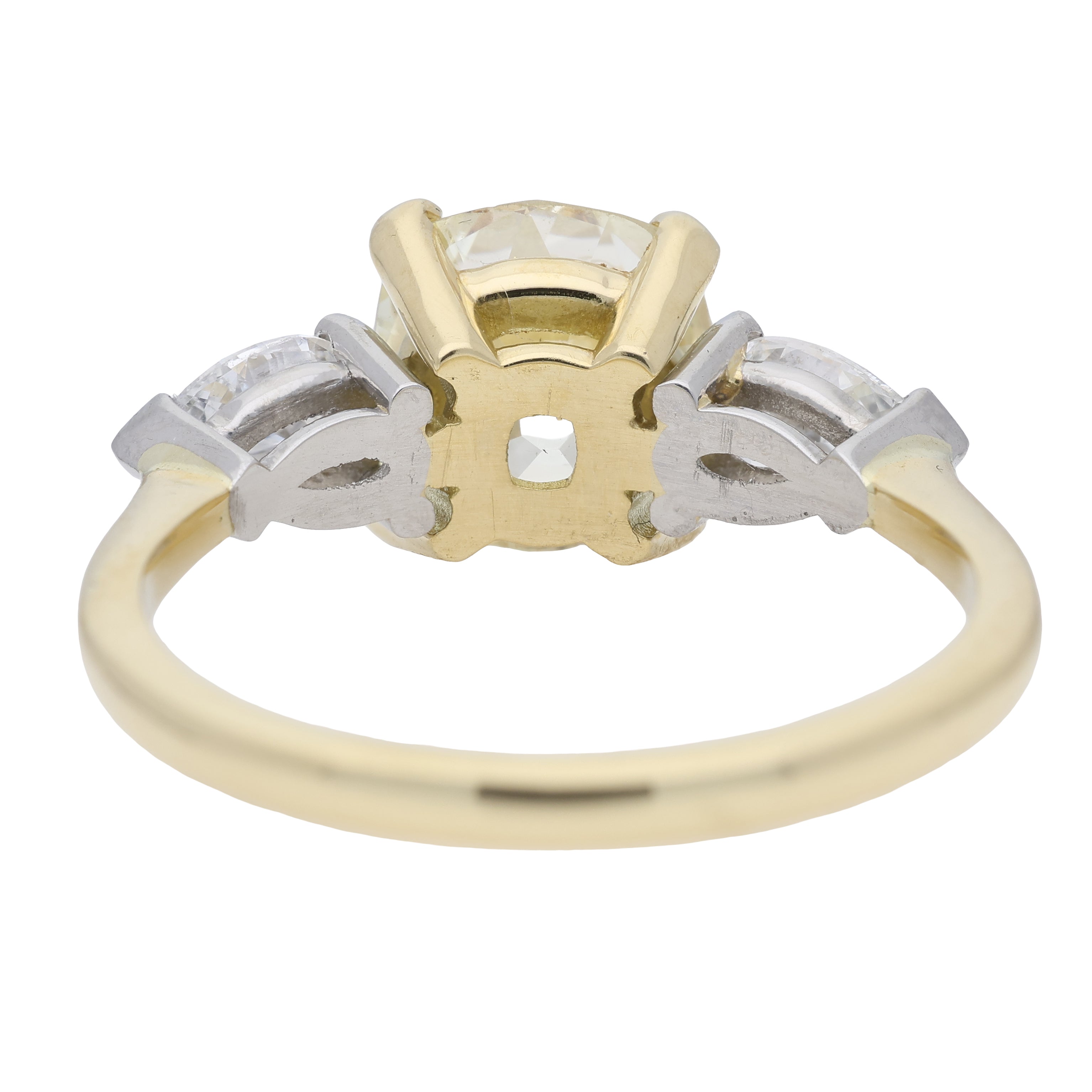 The ring is centrally set with a stunning antique old cushion cut diamond which is securely four claw set in yellow gold. The diamond is then sided by two perfectly matched modern pear cut diamonds, set in platinum to enhance their white colouring.
