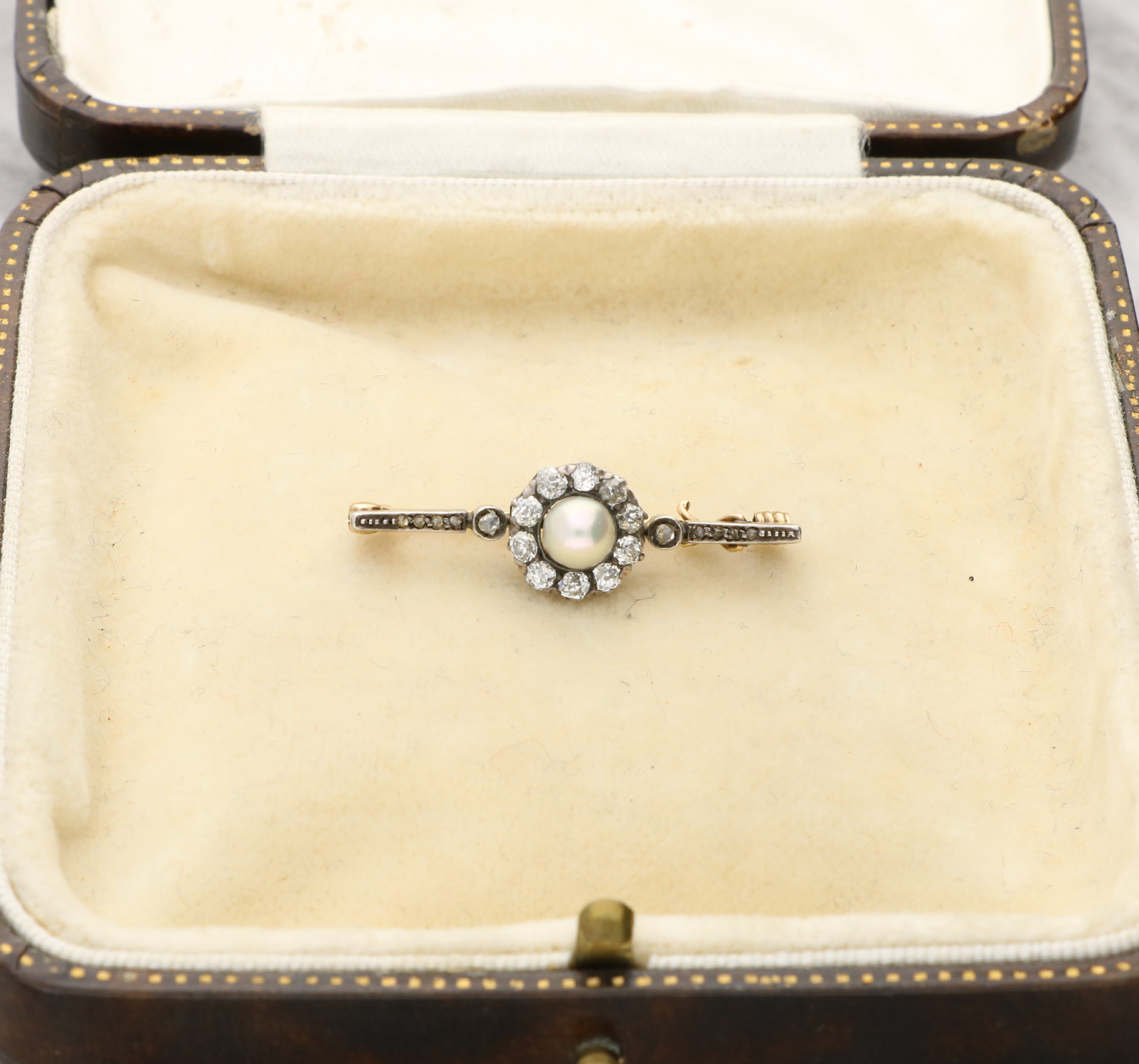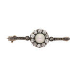 At the centre sits a softly lustrous natural pearl, secured within a halo of rose-cut diamonds arranged in a classic circular cluster. The diamonds display gentle brilliance and subtle irregularity, characteristic of hand-cut stones of the period. The central motif is flanked by fine bar terminals, each accented with small diamonds, creating a harmonious and symmetrical composition.