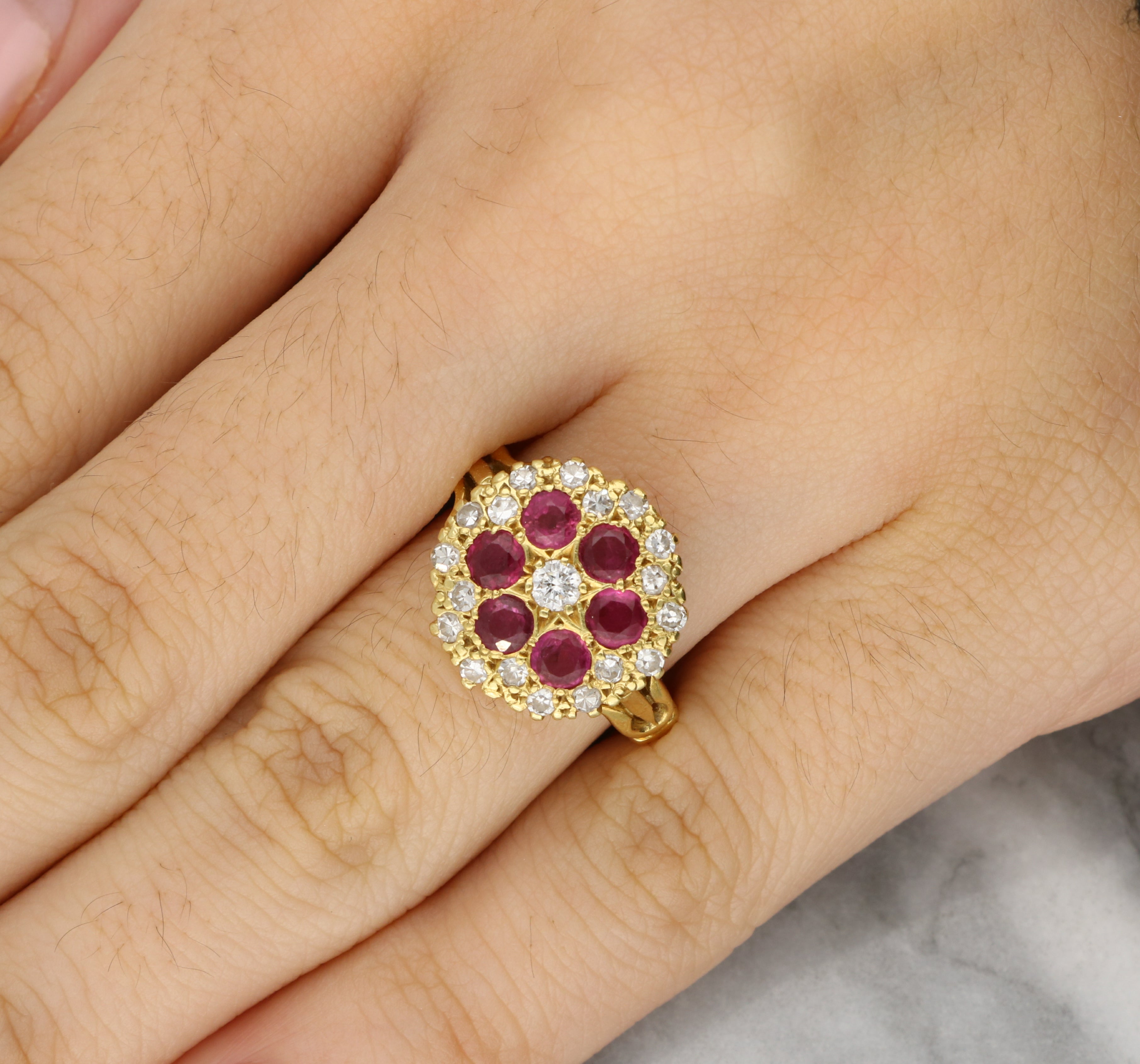 This striking ring features a round-shaped cluster design crafted in 18 carat yellow gold. The ring is set with a vibrant arrangement of six round cut rubies circling a round cut diamond. The richly coloured rubies are framed by a border of round brilliant-cut diamond and old-cut diamonds, creating a halo that enhances the depth and intensity of the gemstones. Milgrain detailing on the face of the ring adds depth and interest which is continued on the band with further scroll detailing, bringing the intricate design down around the finger.