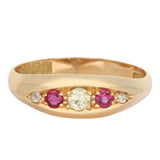 This charming ring is set with five graduated old cut rubies and diamonds set in an alternating pattern. The stones are arranged in a traditional graduating line, with the largest of the three diamonds at the centre, flanked by slightly smaller stones to each side. The stones are secured with yellow gold claws that frame the stones and enhance their bright colour. The design is channel set in 18ct gold, framing the stones and leading into a solid gold band.