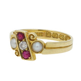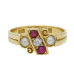 A unique antique ruby, diamond and pearl ring set in 18k yellow gold.