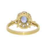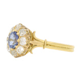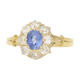 A beautiful antique oval cut sapphire and old cut diamond ring cluster ring set in 18k yellow gold.