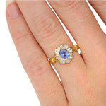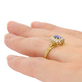 The piece is centrally set with a vibrant oval cut sapphire which is securely claw set. The sapphire is surrounded by beautiful old cut diamonds which highlights the stone perfectly. The head of the ring then leads to an intricately detailed 18k gold band.