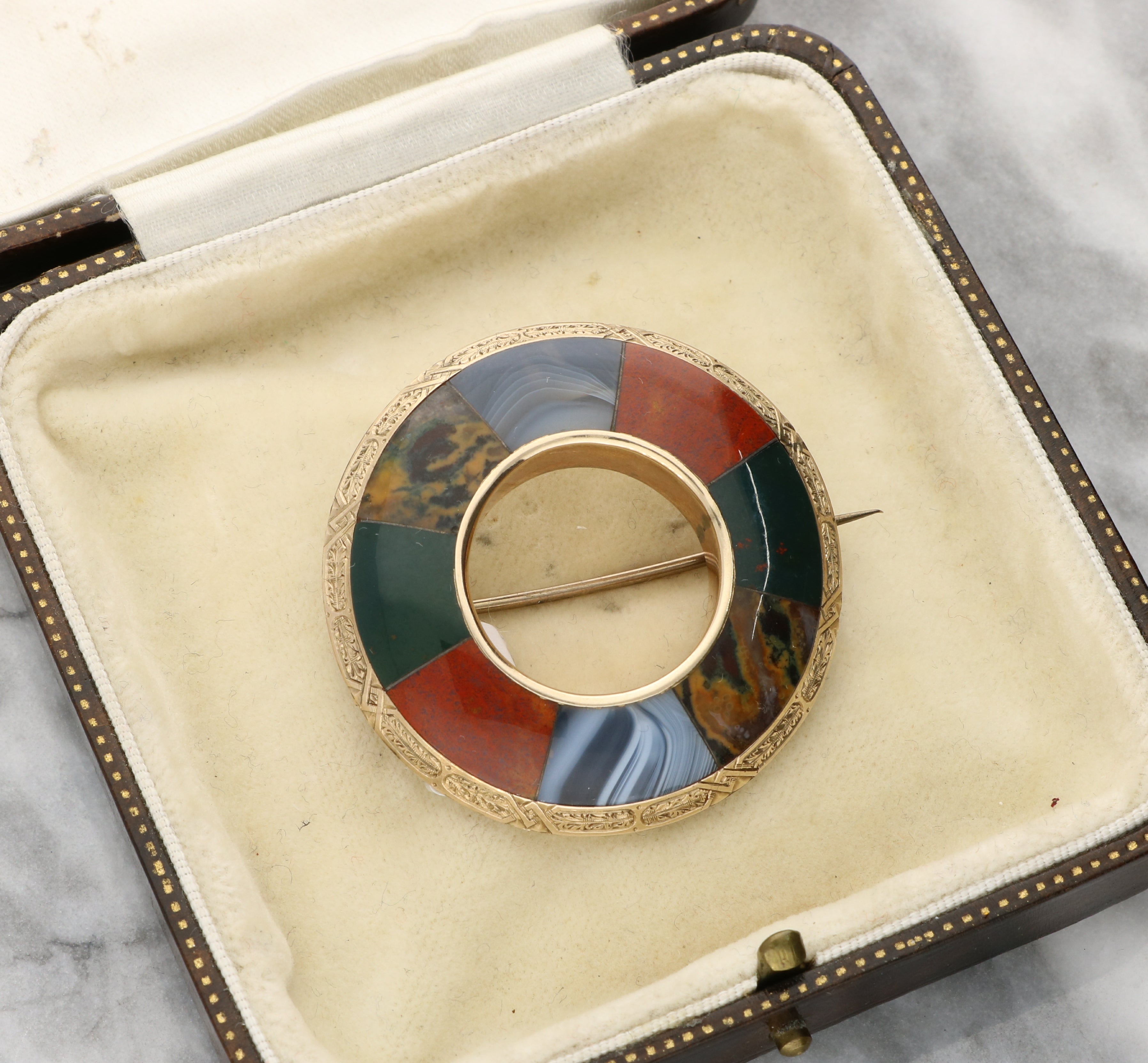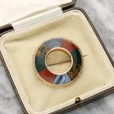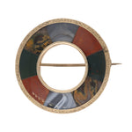 This antique brooch is formed as a circular open design set in 9ct yellow gold. The brooch is inlaid with alternating panels of polished agate, displaying a mix of deep green, red tones, and grey agate, each section neatly fitted to create a balanced circular pattern.