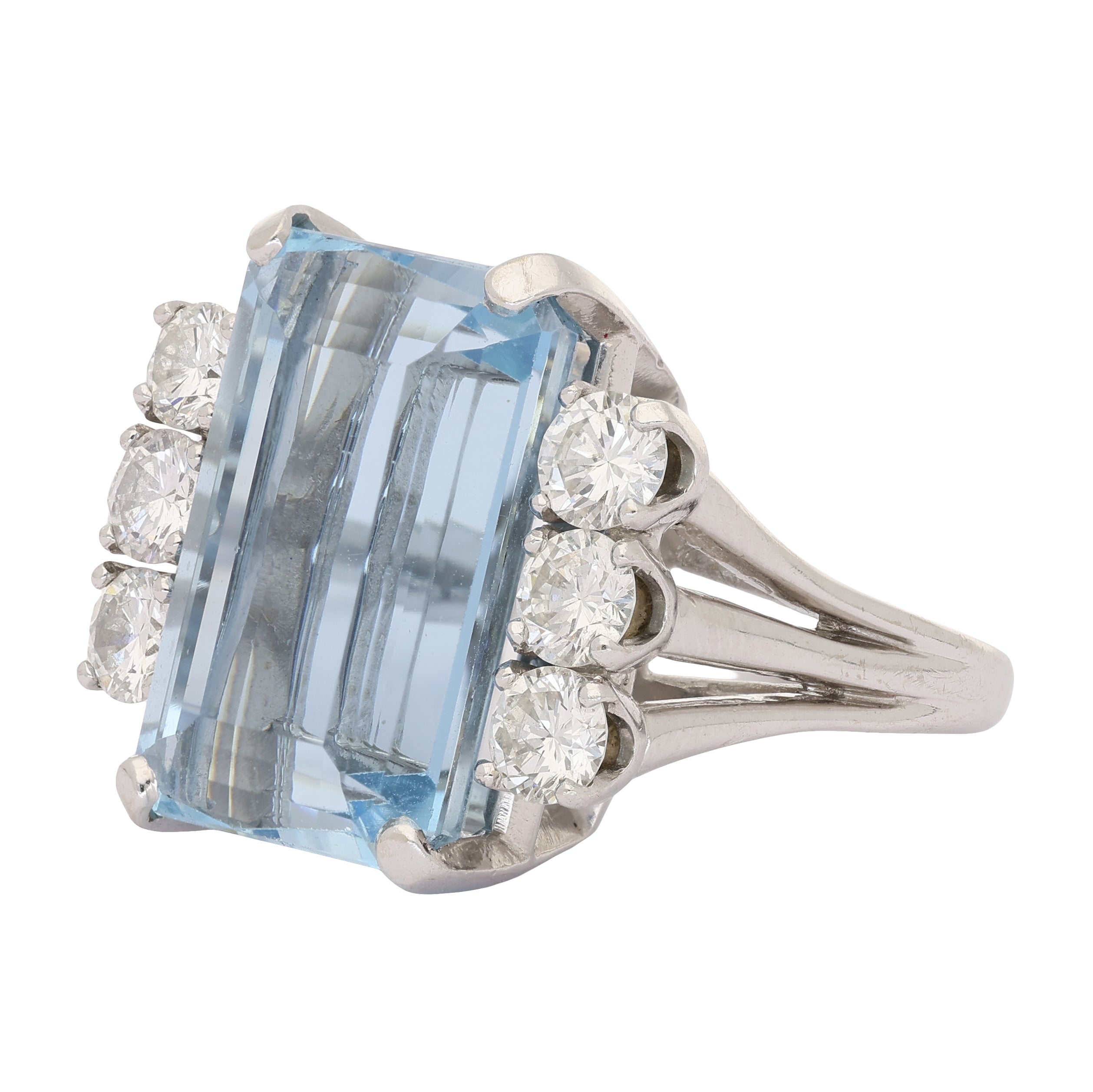 This elegant ring is crafted in 14 carat gold and set with a beautifully faceted emerald cut aquamarine as the focus. The gemstone displays a delicate, icy blue tone with wonderful clarity and light reflection. Flanking the aquamarine are three round brilliant cut diamond on each shoulder.