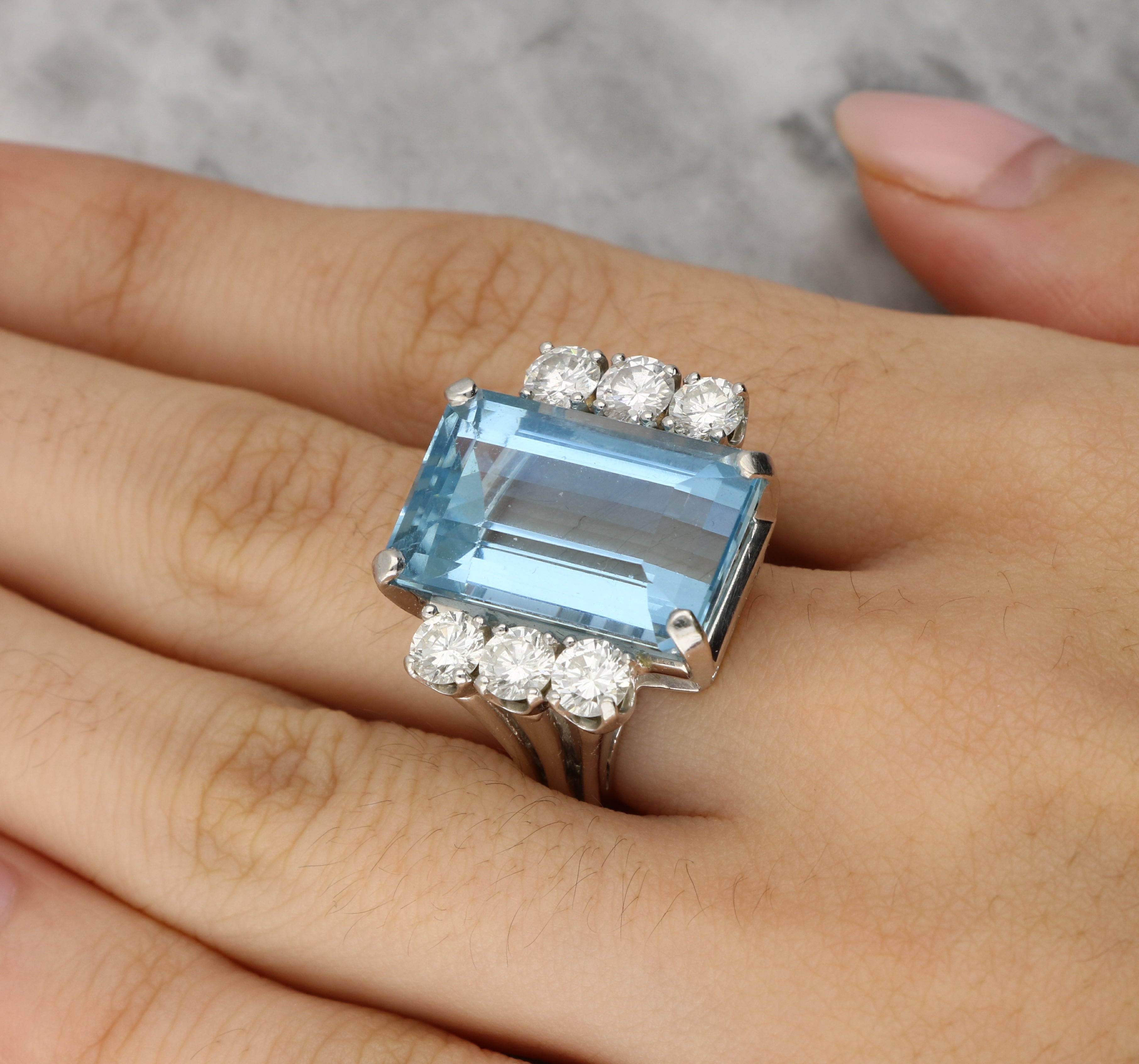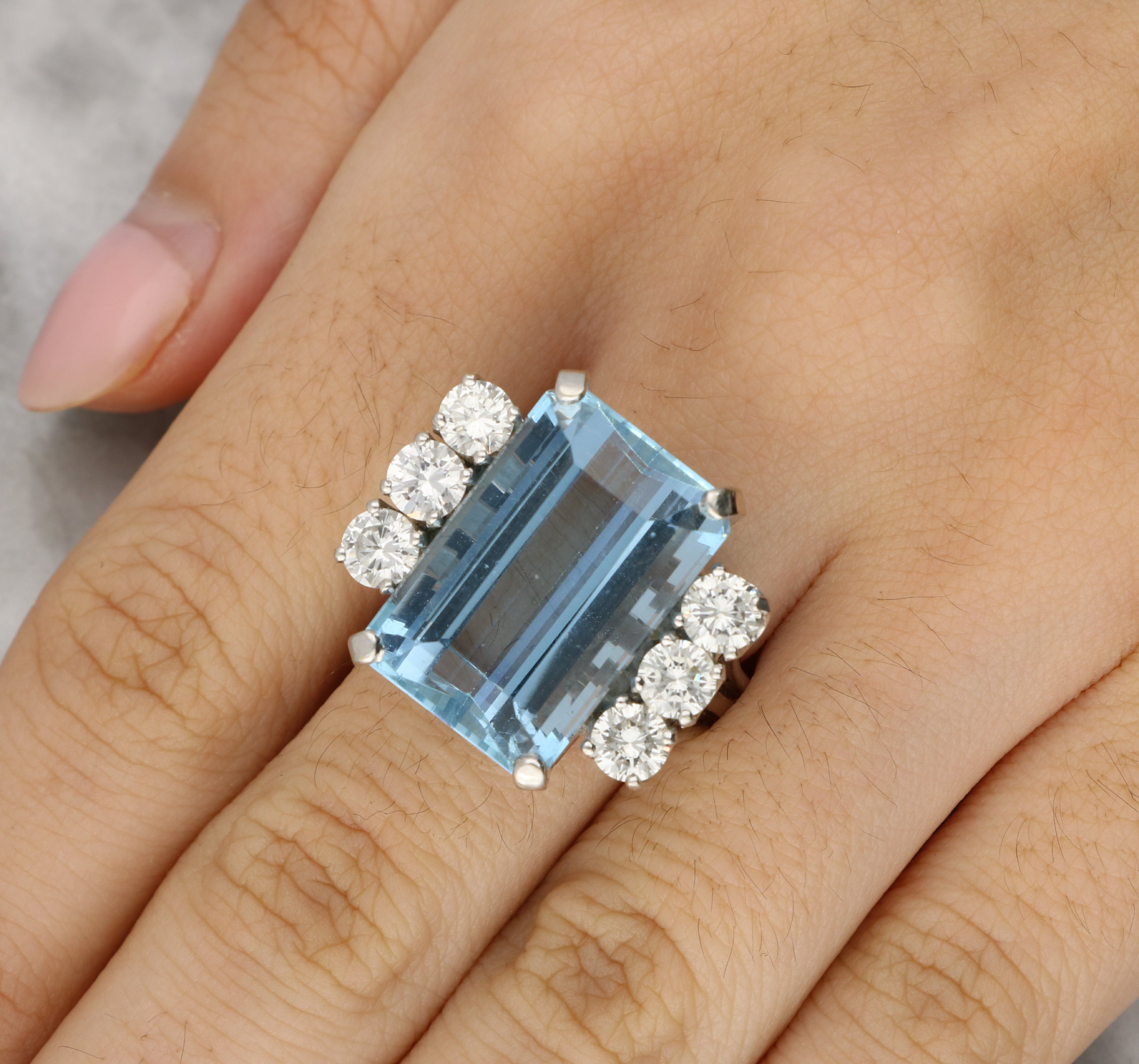 - Stone Weight: The aquamarine has an estimated 16cts and an estimated total diamond weight of 1.50cts.