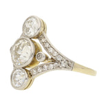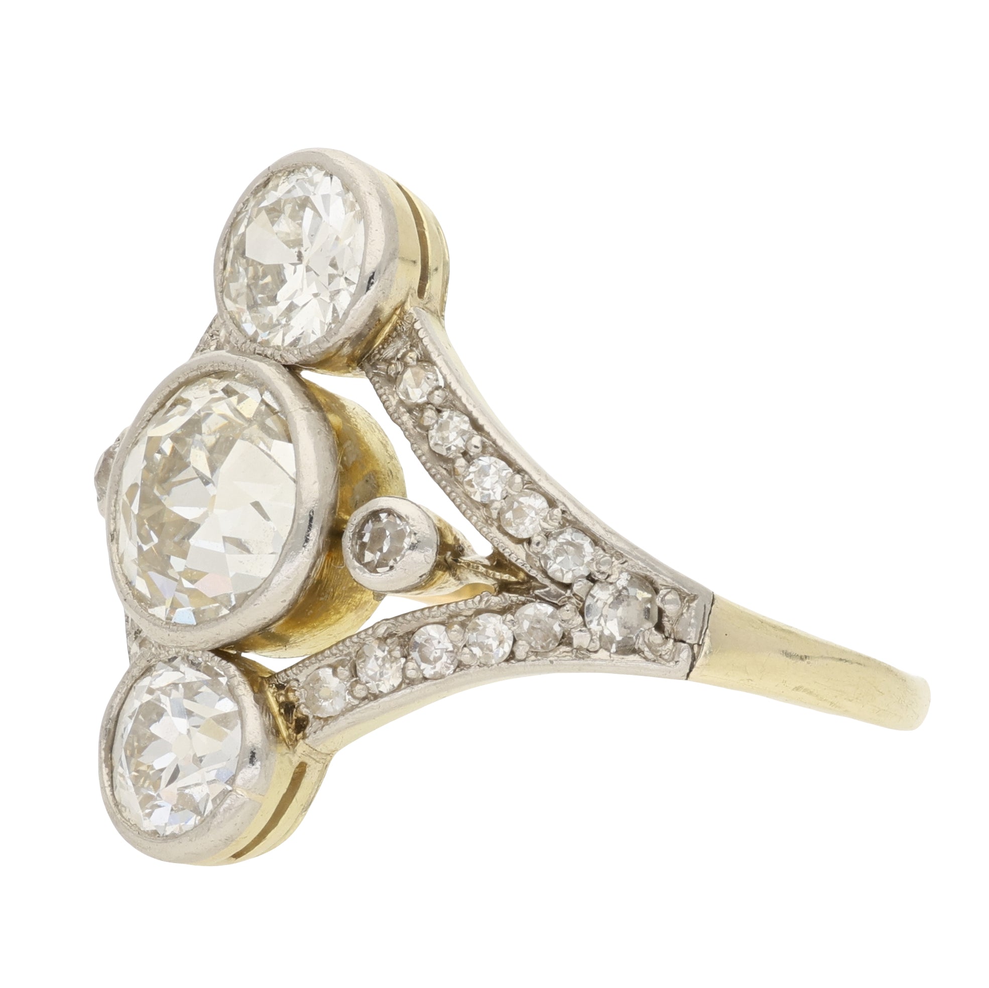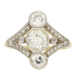 This striking Art Deco ring features three old cut diamonds arranged vertically, with a larger central diamond flanked by two slightly smaller stones above and below. Each diamond is set within smooth rub-over settings, enhancing their brilliance while offering an architectural look. The openwork diamond-shaped frame is delicately set with additional old cut diamonds along the shoulders, creating beautiful symmetry and intricate detail.
