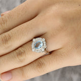 Surrounding the aquamarine is a cluster of round brilliant cut diamonds, arranged in a halo that adds sparkle. The diamonds are individually set, creating a balanced look that highlights the central stone without overpowering it.