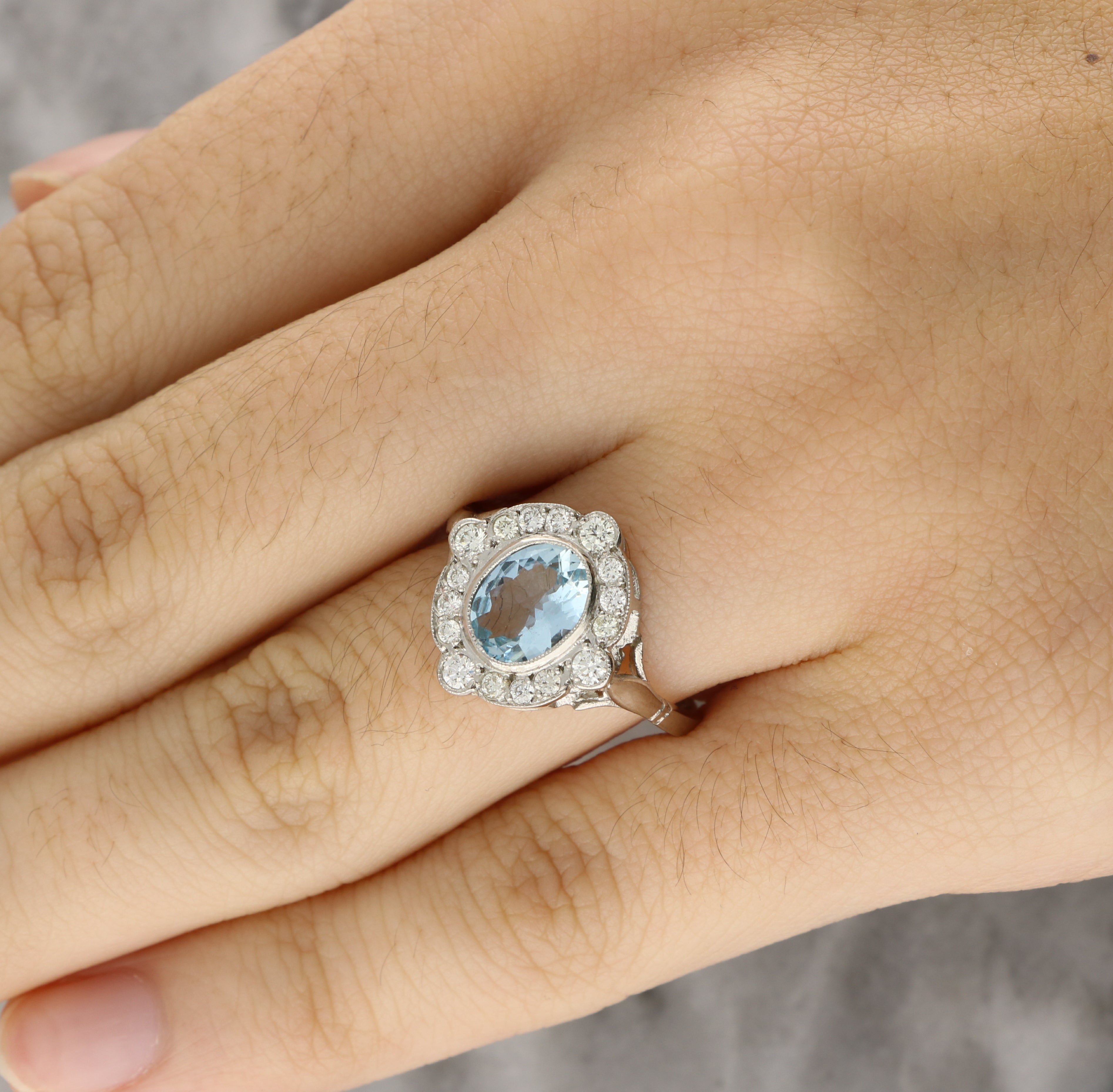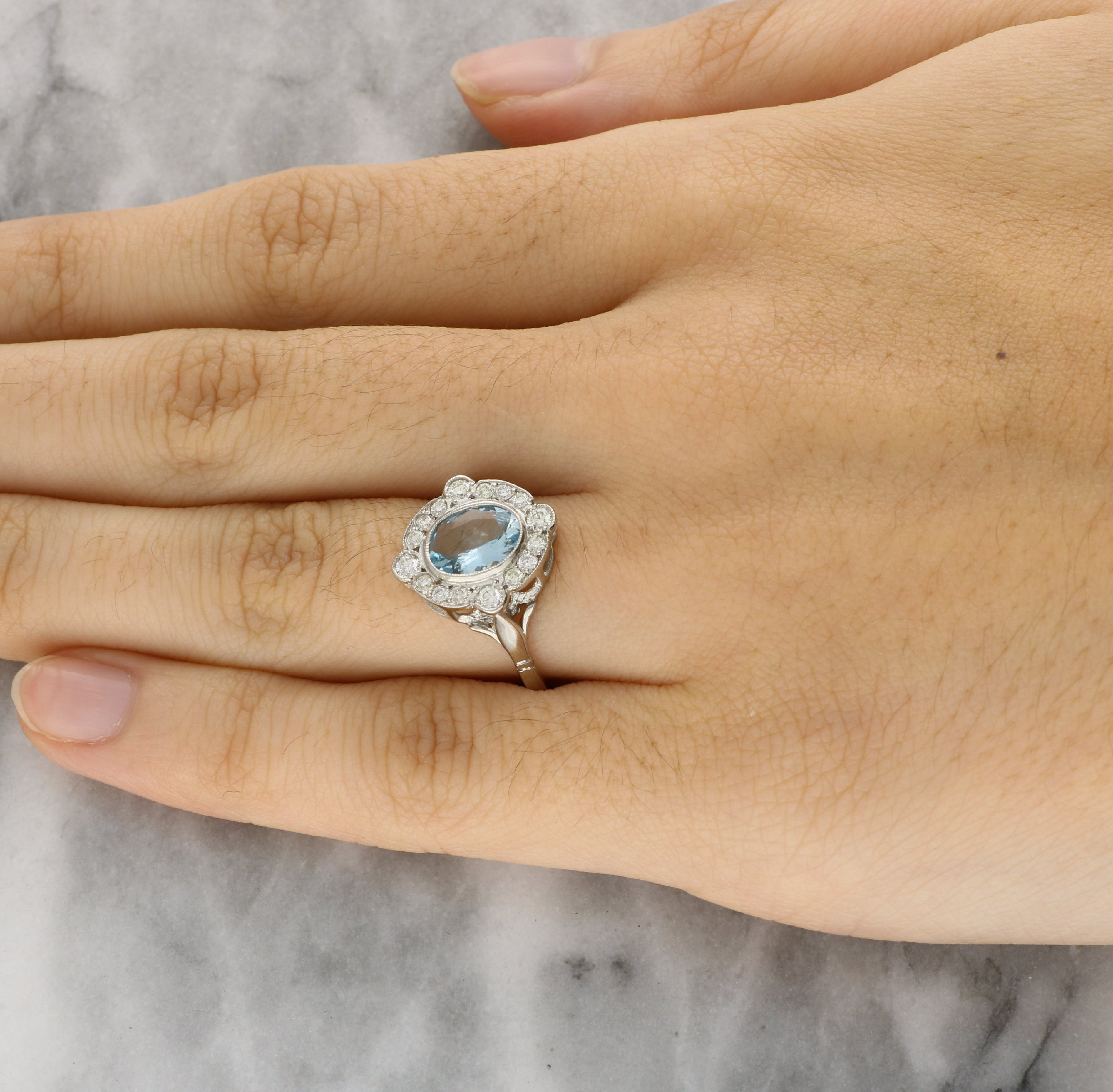 This ring features an oval cut aquamarine at its centre, displaying a soft blue hue. The gemstone is set within a finely detailed white gold bezel with delicate milgrain detailing, enhancing its shape while offering a secure and elegant setting.