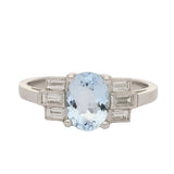 Flanking the aquamarine are stepped diamond baguettes on each shoulder, arranged in a geometric Art Deco-inspired design. The clean lines and symmetrical layout create a refined architectural look, while subtle milgrain edging adds a touch of period charm.