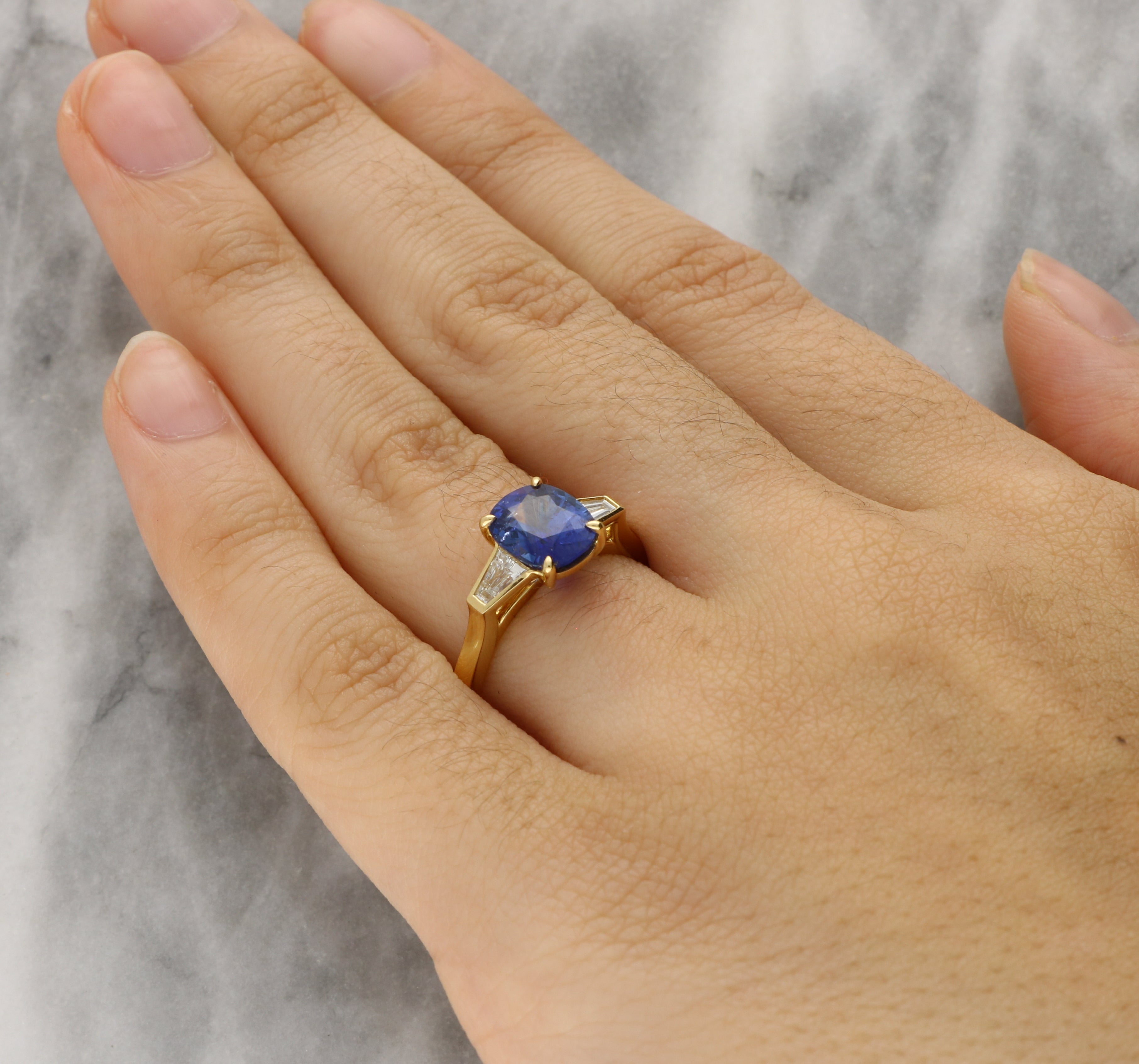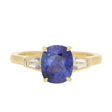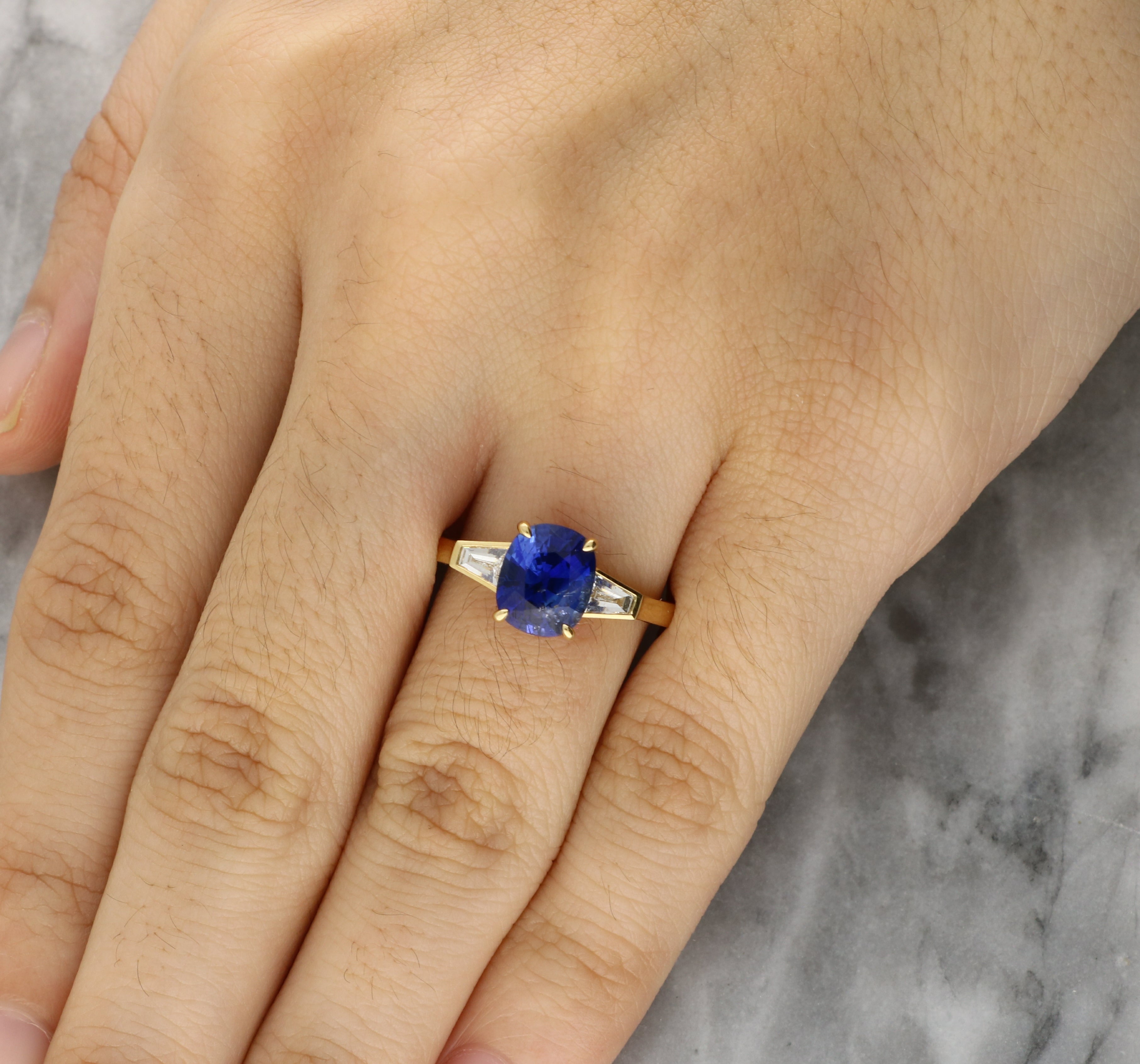 This gorgeous ring is crafted in 18K yellow gold and features a richly coloured oval-cut sapphire at its centre, secured by fine claw settings. The deep blue sapphire is flanked on either side by tapered baguette-cut diamonds, adding a refined brilliance and drawing the eye toward the vibrant centre stone.