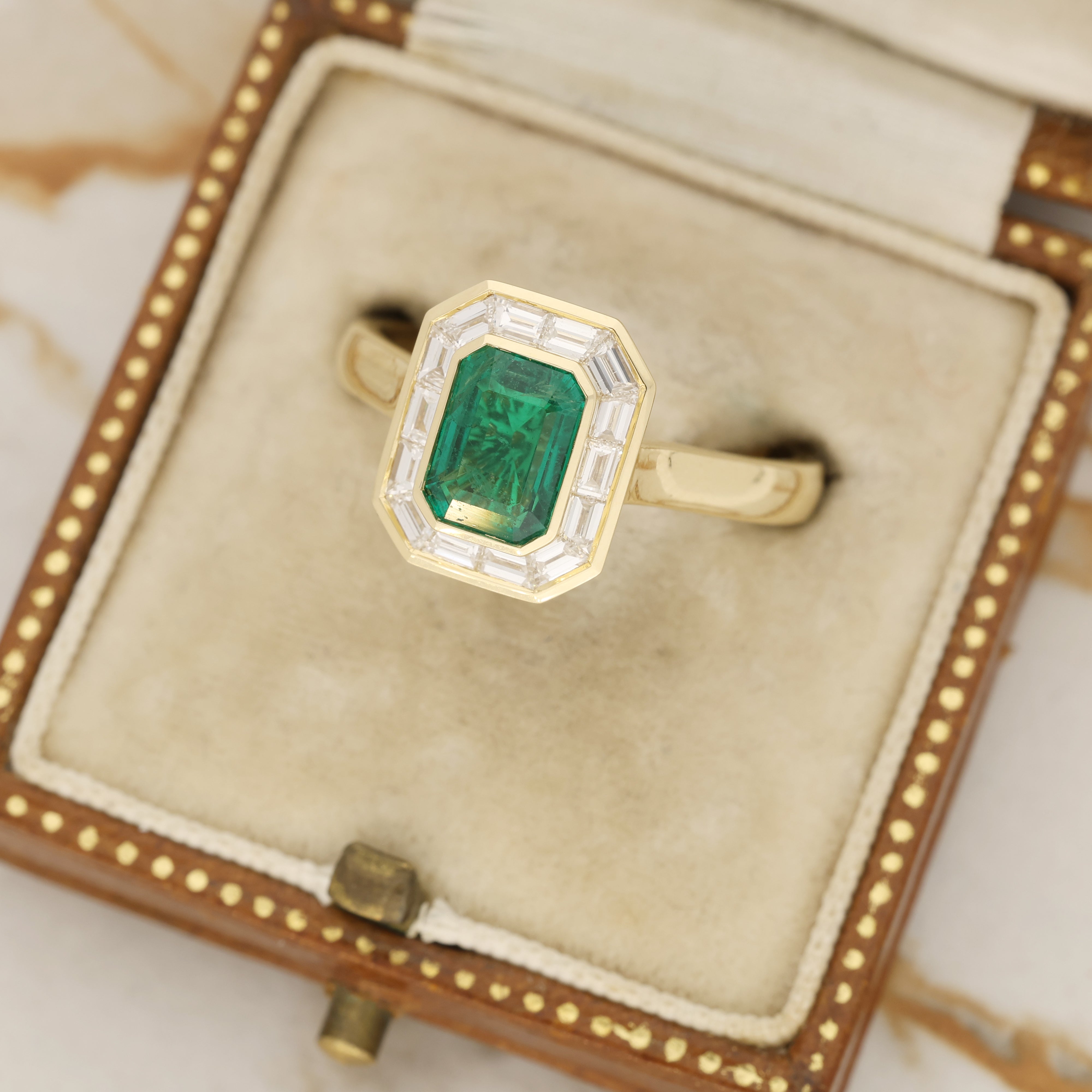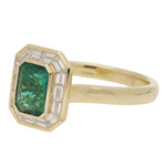 This 18ct gold ring features a vibrant emerald cut emerald at its centre, securely bezel set. Surrounding the emerald is a geometric halo of fourteen baguette cut diamonds, arranged in an octagonal design. Each baguette is neatly channel set, creating a smooth, continuous outline around the central stone. The head of the ring leads into a polished 18ct gold band.