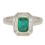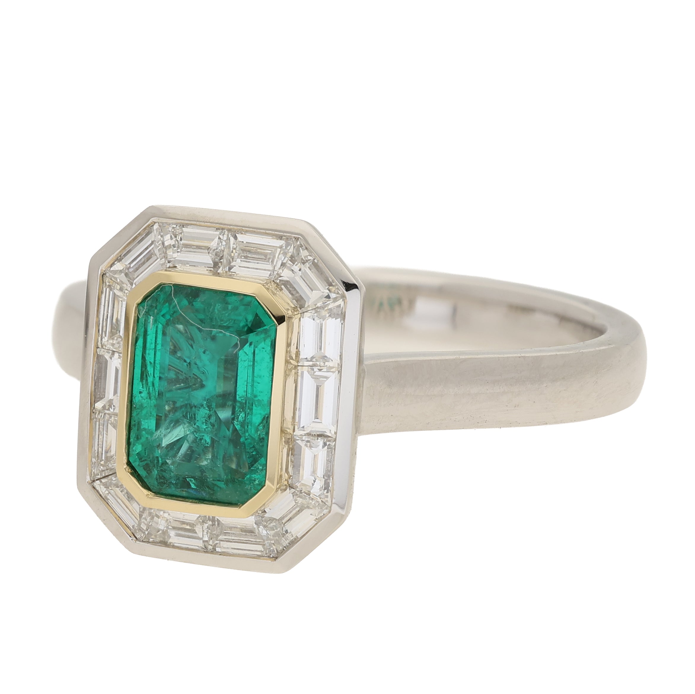This lovely ring is crafted in platinum and 18ct yellow gold and centres on a vivid emerald, prized for its rich green colour. The emerald is framed by a bold geometric arrangement of diamonds, including baguette-cut stones, creating a distinctive Art Deco silhouette.
